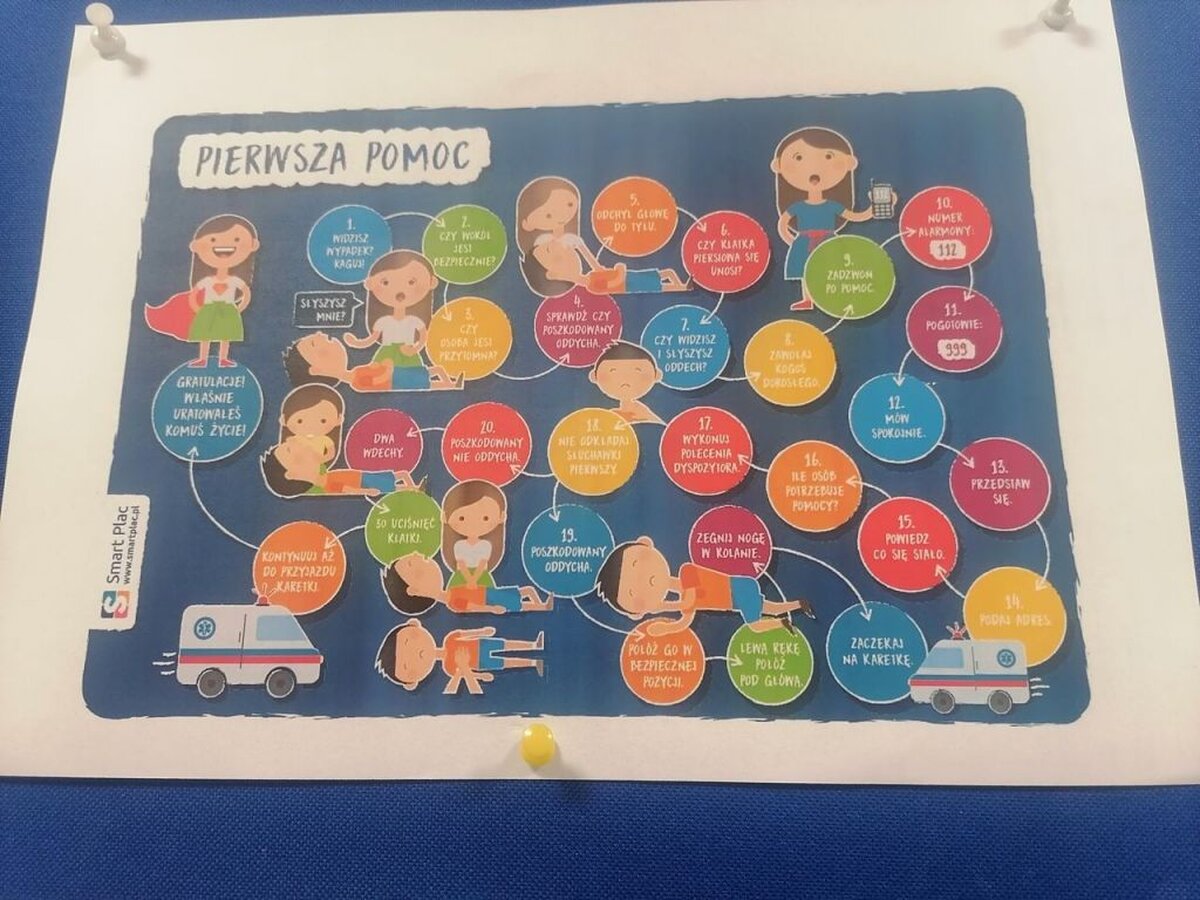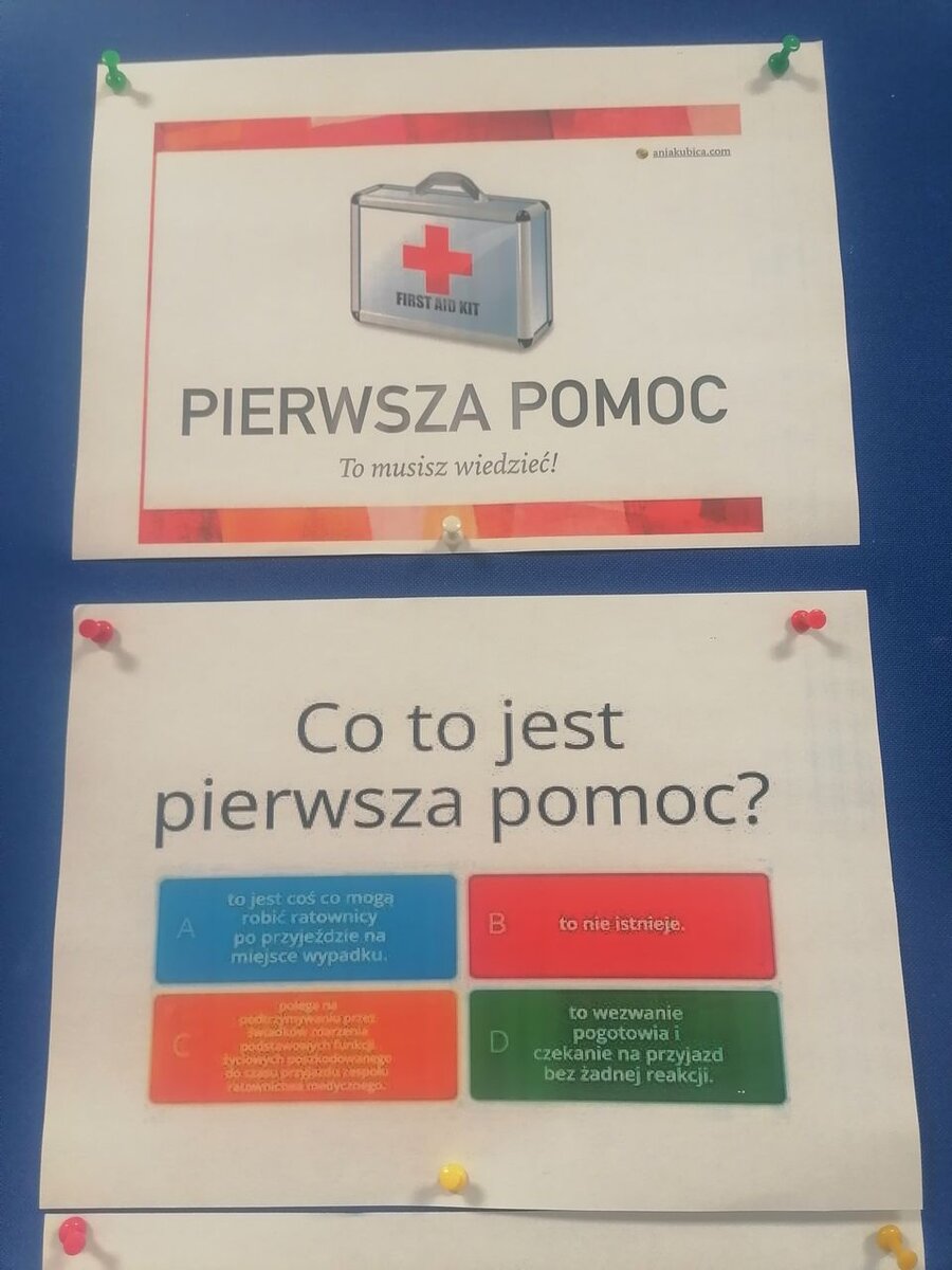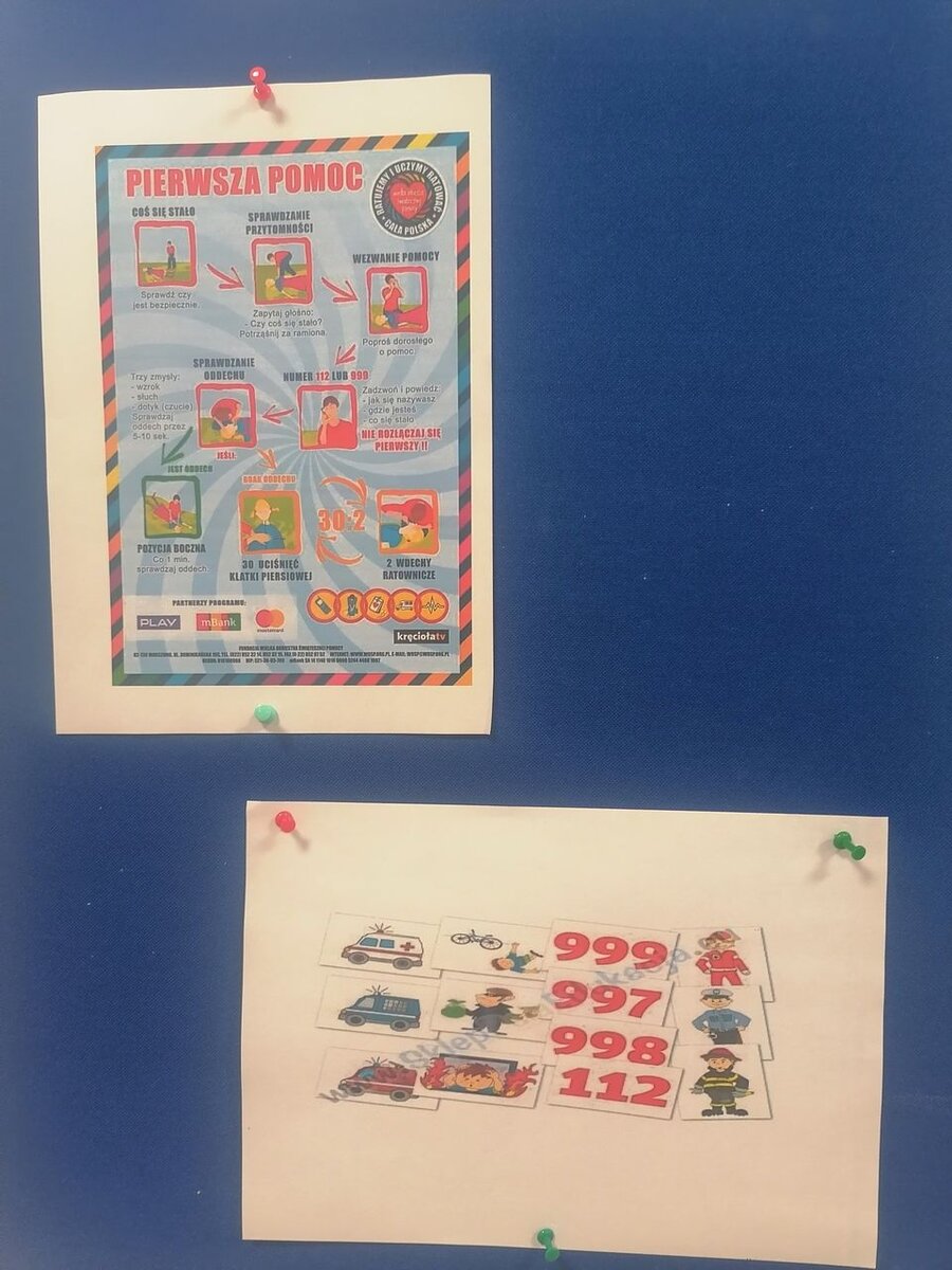 Podczas pogadanki na temat pierwszej pomocy uczniowie dowiedzieli się, w jaki sposób można uratować komuś życie, jak prawidłowo przeprowadzić resuscytację krążeniową. Przypomnieliśmy sobie ważne telefony alarmowe oraz nauczyliśmy, jakie informacje należy przekazać , gdy zgłaszamy wypadek na numer 112.