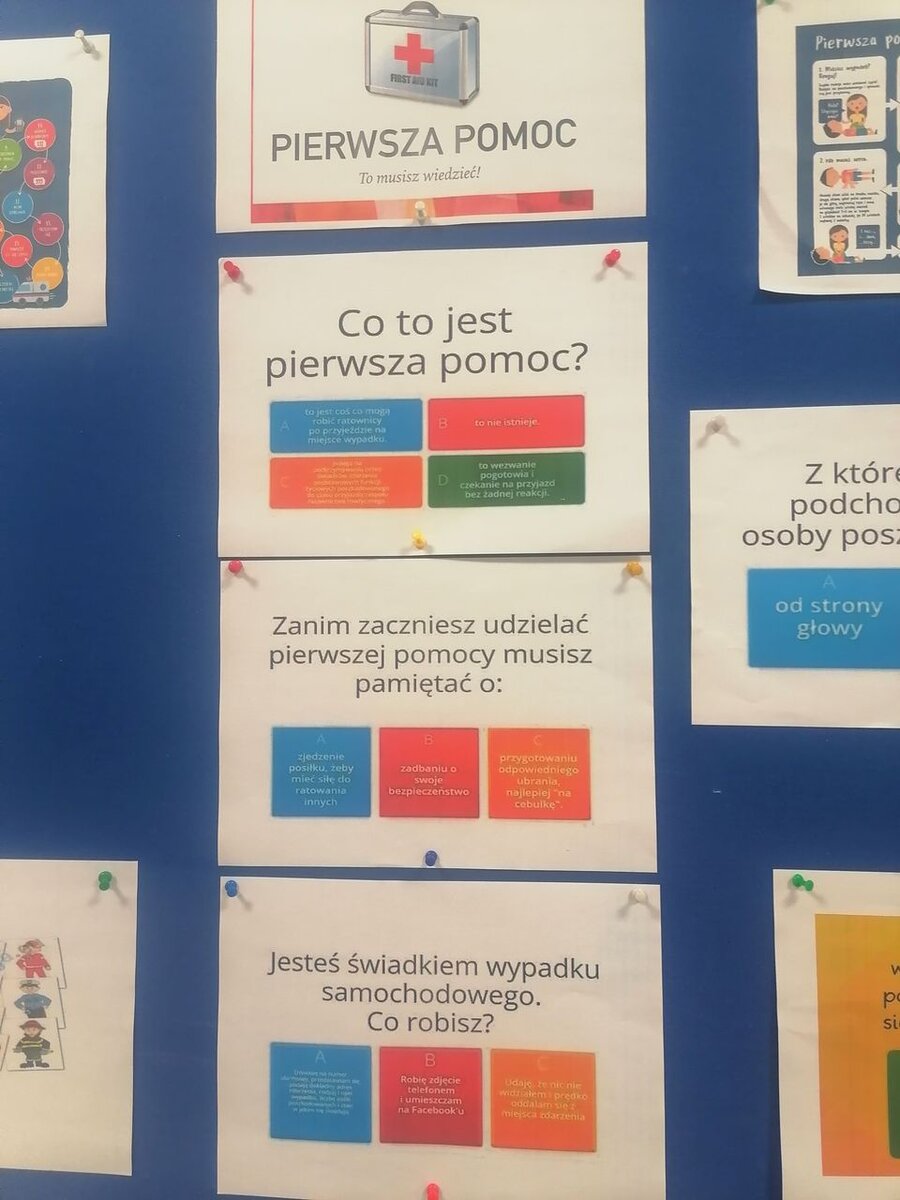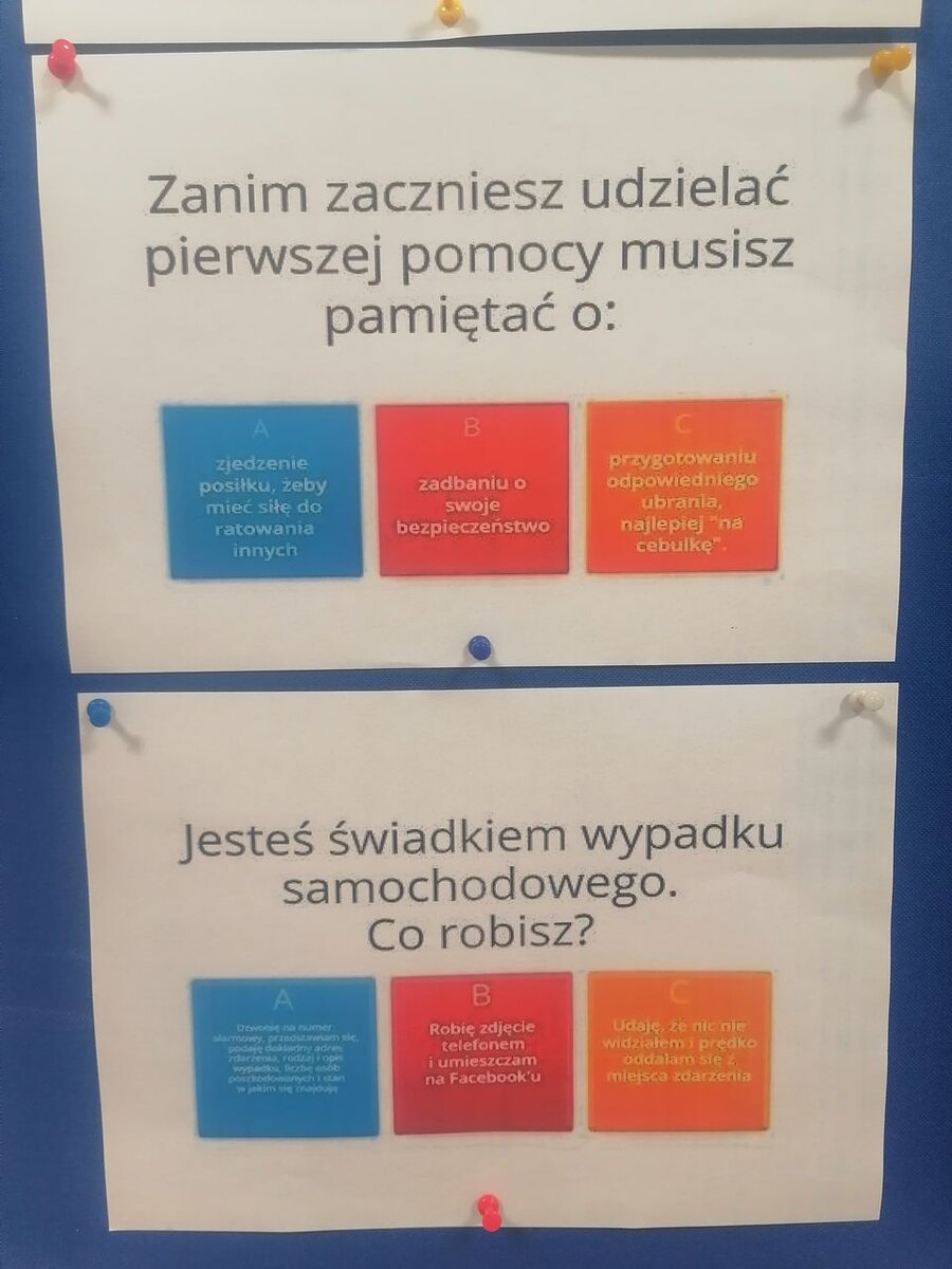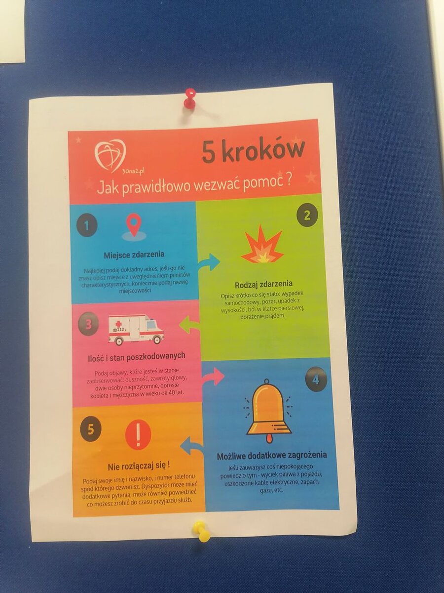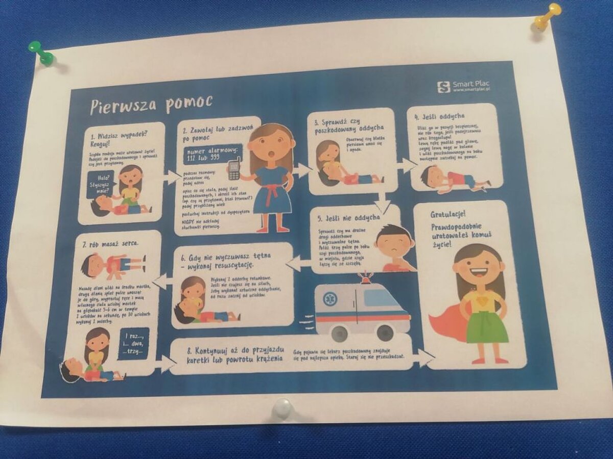 Podczas pogadanki na temat pierwszej pomocy uczniowie dowiedzieli się, w jaki sposób można uratować komuś życie, jak prawidłowo przeprowadzić resuscytację krążeniową. Przypomnieliśmy sobie ważne telefony alarmowe oraz nauczyliśmy, jakie informacje należy przekazać , gdy zgłaszamy wypadek na numer 112.