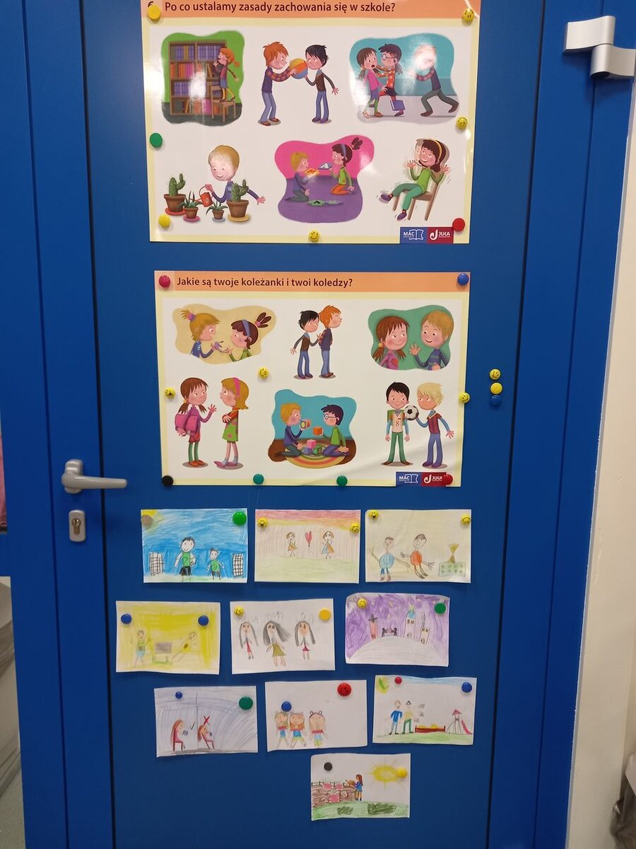 Podczas zajęć na świetlicy szkolnej kształtowaliśmy kulturę osobistą i umiejętność opiekowania się i pomagania młodszym oraz okazywanie sobie wzajemnego szacunku. Rozwijaliśmy kompetencje społeczno-emocjonalne, uczyliśmy się rozwiązywać konflikty, a także rozpoznawaliśmy swoje uczucia i emocje. Zastanawialiśmy się wspólnie jak radzić sobie z własnym gniewem, jak opanowywać i przezwyciężać złość i agresję. Na zajęciach plastycznych przedstawialiśmy swoje portrety w różnych nastrojach, a także wykonywaliśmy plakaty życzliwości. Ponadto bawiliśmy się na boisku szkolnym i placu zabaw oraz integrowaliśmy się podczas zabaw w salach.