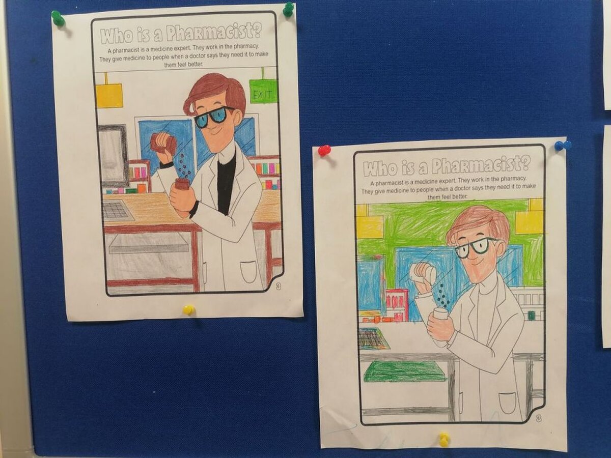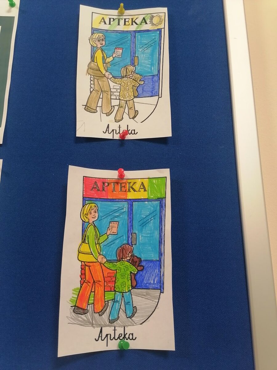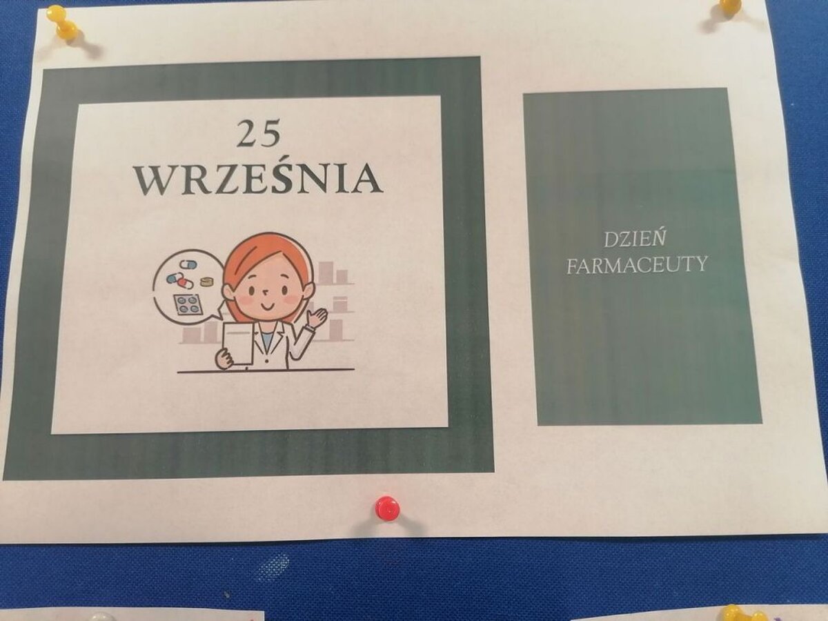 W dniu 25 września obchodziliśmy Dzień Farmaceuty. Dzieci podczas pogadanki uzupełniły swoją wiedzę, na czym polega praca w aptece, jakie urządzenia są potrzebne do sporządzenia leków recepturowych. Z ciekawością wysłuchały informacji, czym jest farmacja oraz jakie predyspozycje powinny posiadać osoby, które chcą wykonywać ten zawód. Dowiedziały się również, jakie rośliny rosnące w naszym najbliższym otoczeniu mają działanie lecznicze oraz jak ważne jest przyjmowanie środków farmakologicznych tylko wskazanych przez lekarza i pod kontrolą osób dorosłych. Uczniowie wykonali również pracę plastyczną, związaną z apteką i zawodem farmaceuty.