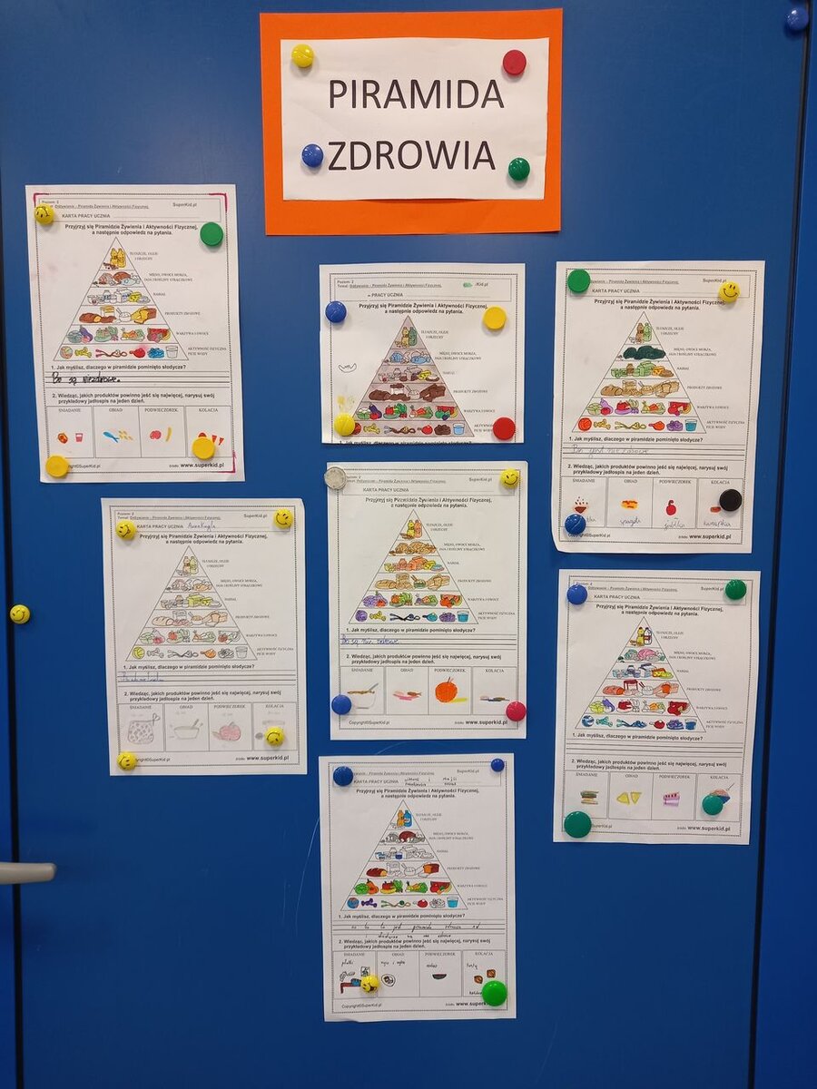 W ubiegłym tygodniu omówione zostały zasady zdrowego odżywania oraz piramida zdrowego żywienia. Wychowawcy świetlicy przeprowadzili także liczne rozmowy na temat darów jesieni, czyli sezonowych warzyw i owoców z sadów i ogrodów, które są doskonałym źródłem witamin oraz zwracali uwagę na konieczność dokładnego mycia warzyw i owoców. Przedstawiona została również zasada kulturalnego i bezpiecznego spożywania posiłków. Ponadto dzieci dowiedziały się dlaczego sport i ruch jest tak bardzo ważny dla zdrowia człowieka i jak istotne jest dbanie o swoją kondycję fizyczną. Z kolei nasi uczniowie chętnie opowiadali o wpływie jesiennej pogody na samopoczucie, zdrowie i ubiór dorosłego człowieka jak i dziecka. Co więcej dzieci przy pomocy wychowawców świetlicy samodzielnie wykonywały piramidę żywieniową.