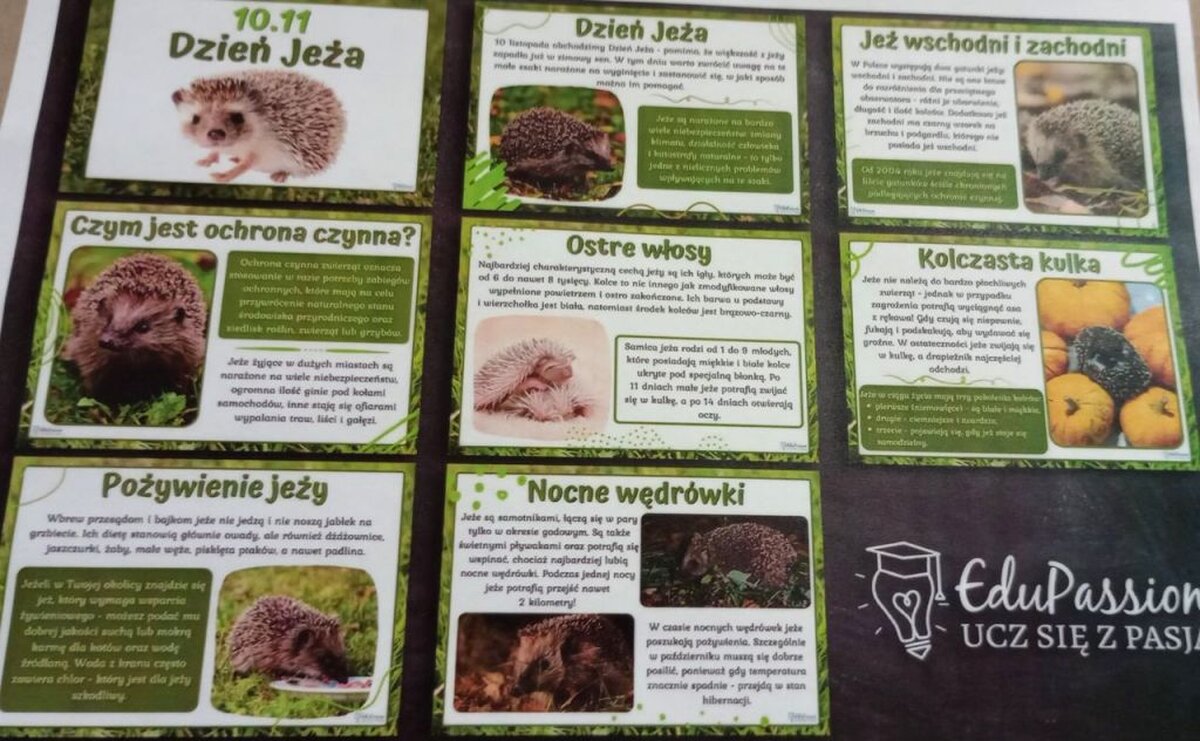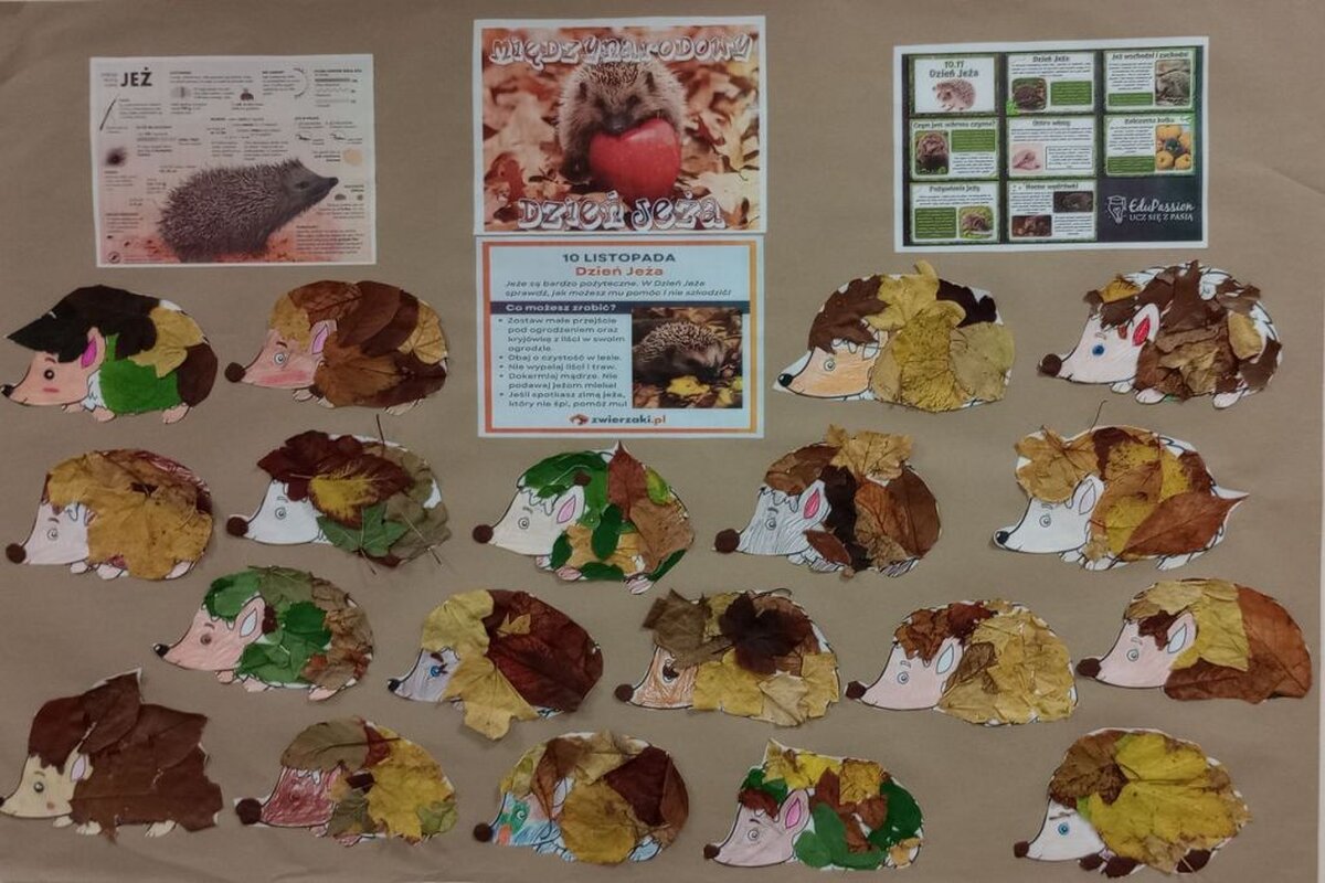 Z okazji „Międzynarodowego Dnia Jeża”, który przypada na dzień 10 listopada w świetlicy szkolnej odbyły się zajęcia dotyczące jeży i ich ochrony. Realizowane były tematy związane z tym kolczastym zwierzątkiem. Dzieci poznały budowę jeża, dowiedziały się czym żywią się jeże oraz poznały zwyczaje tych zwierząt. Dowiedziały się, dlaczego należy je chronić. Dzieci rozwiązywały zagadki, słuchały piosenek. Na koniec zajęć uczniowie wykonali pracę plastyczną, która przyozdobiła salę świetlicową.