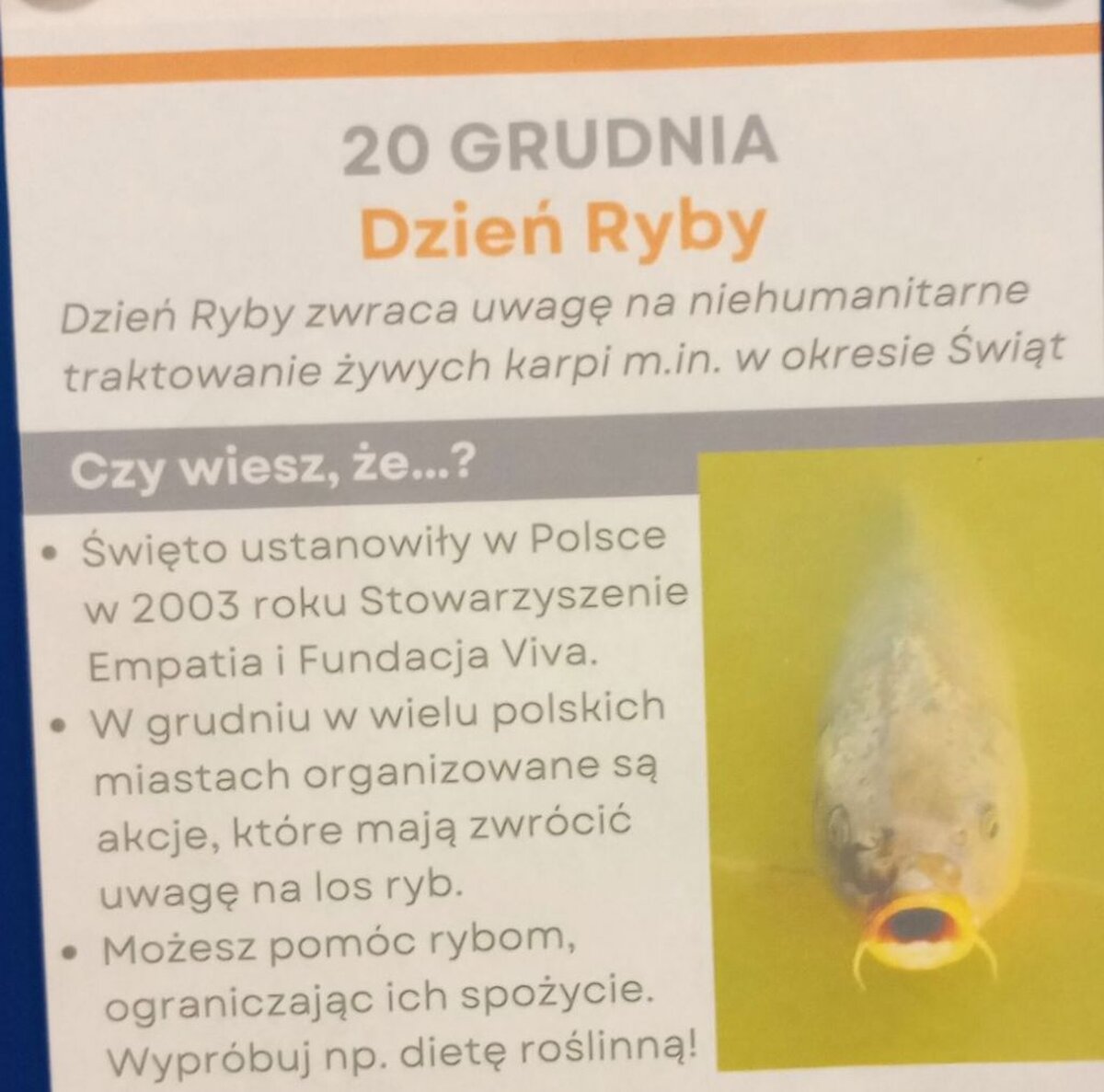 Dzień Ryby ma na celu promowanie humanitarnego traktowania karpi świątecznych. Na zajęciach omówione zostały także wybrane gatunki ryb, rozmawialiśmy o rybactwie i rybołówstwie oraz omówiona została budowa ryby. Dzieci dowiedziały się również dlaczego ryby nie toną a na koniec zajęć wykonały pracę plastyczną.
