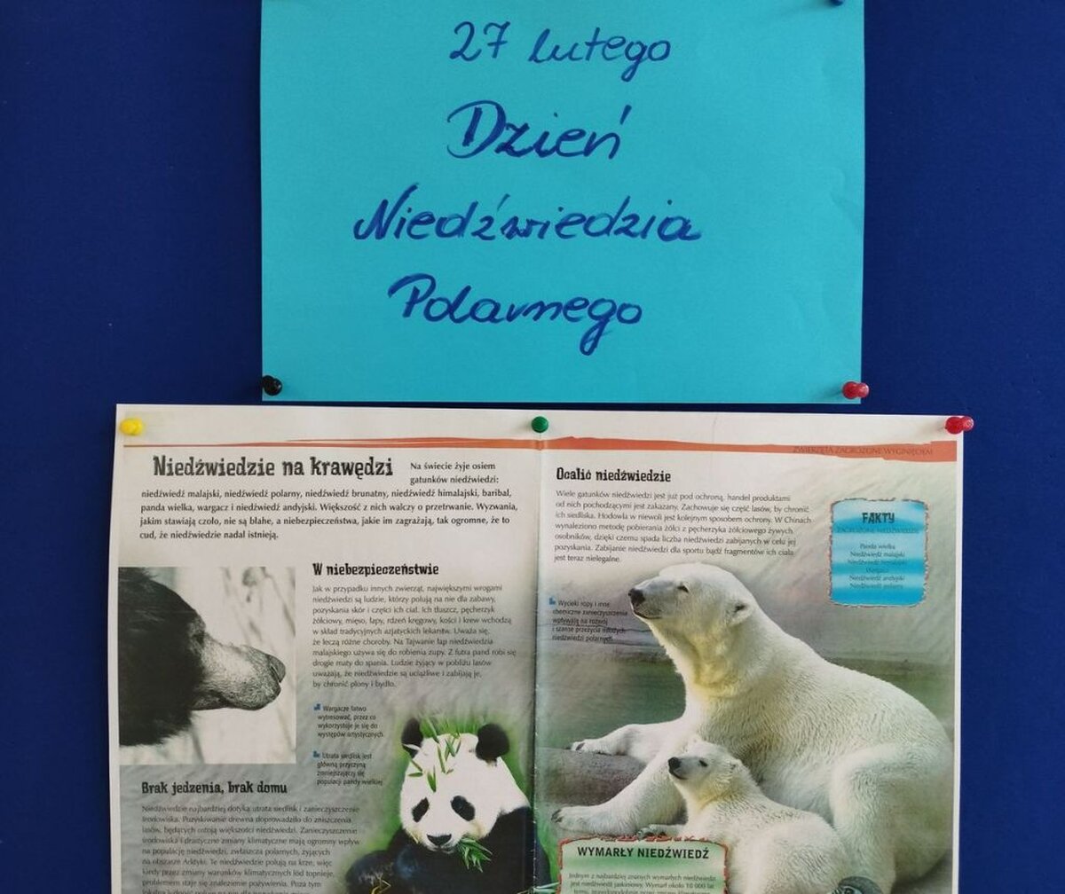 7 lutego na całym świecie obchodzony jest Dzień Niedźwiedzia Polarnego. Niedźwiedź polarny jest zwierzęciem wzbudzającym ludzką sympatię - jest bielutki, puchaty a jego pysk wygląda na uśmiechnięty, Młode niedźwiadki wyglądają jak pluszowe przytulanki. Tymczasem jest to największy lądowy drapieżnik. Niedźwiedzie wykształciły cechy wyglądu i zachowania umożliwiające im przetrwanie w niegościnnym środowisku Arktyki. Zniszczenie tego środowiska będzie oznaczać dla nich zagładę. Dzieci uczęszczające do naszej świetlicy wzięły udział w zajęciach o niedźwiedziu polarnym. Miały one na celu uwrażliwienie dzieci na potrzebę ochrony tego zagrożonego gatunku. Na zakończenie wykonały misia polarnego z papierowych tacek.
