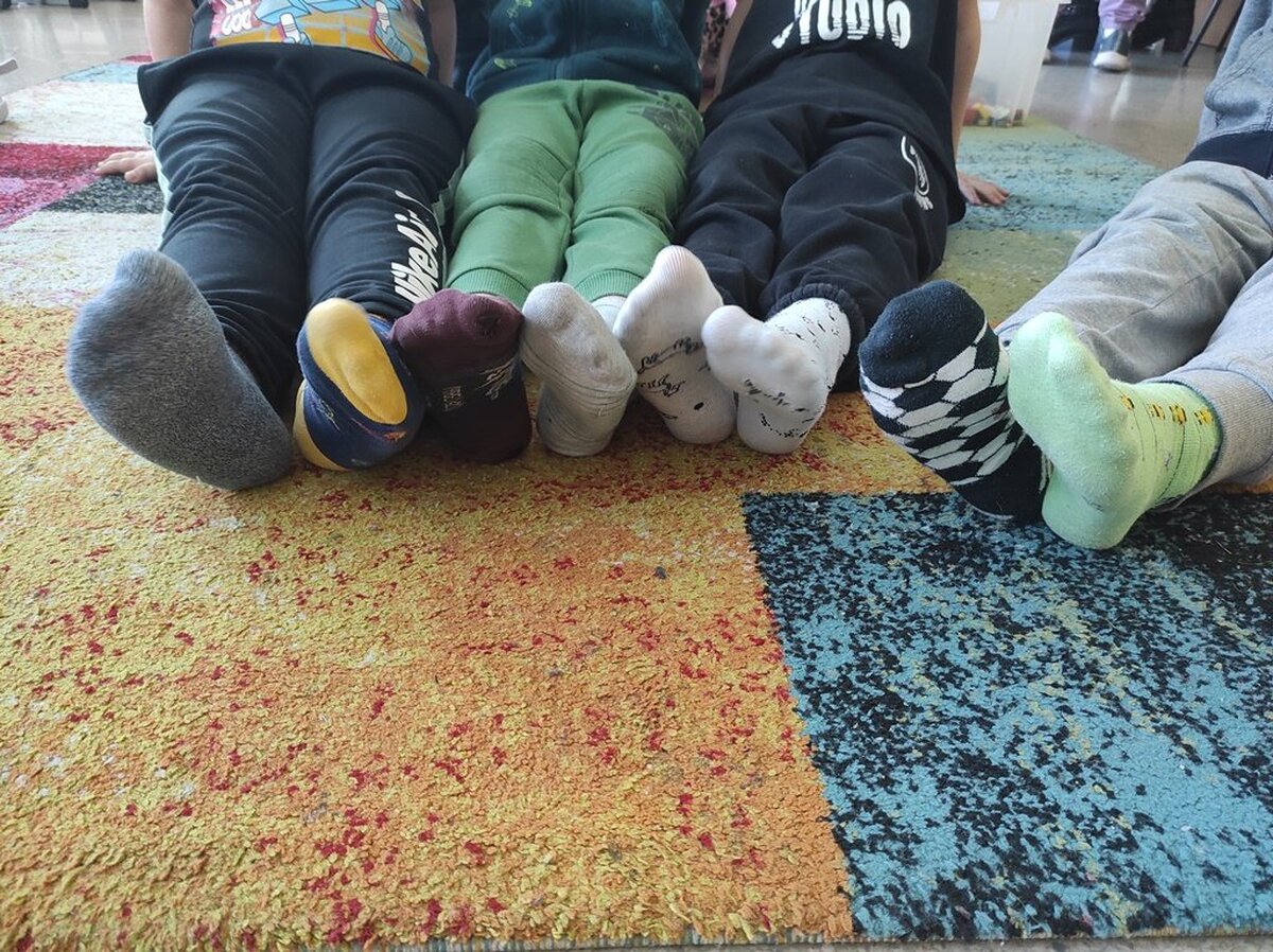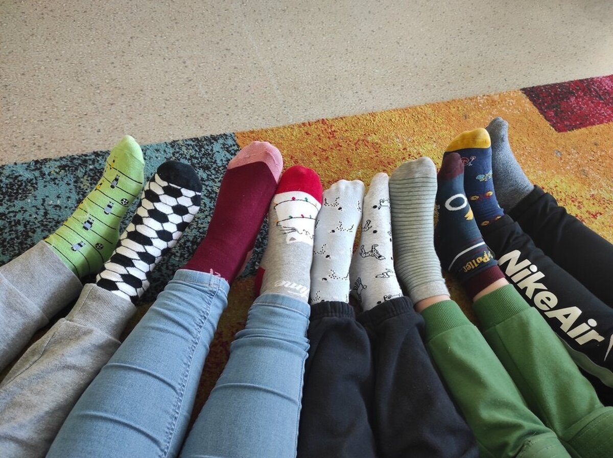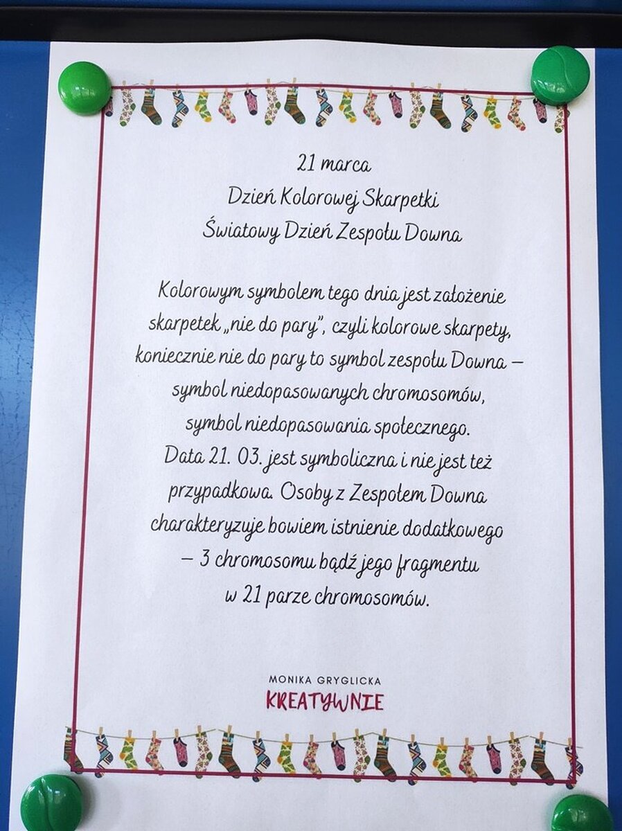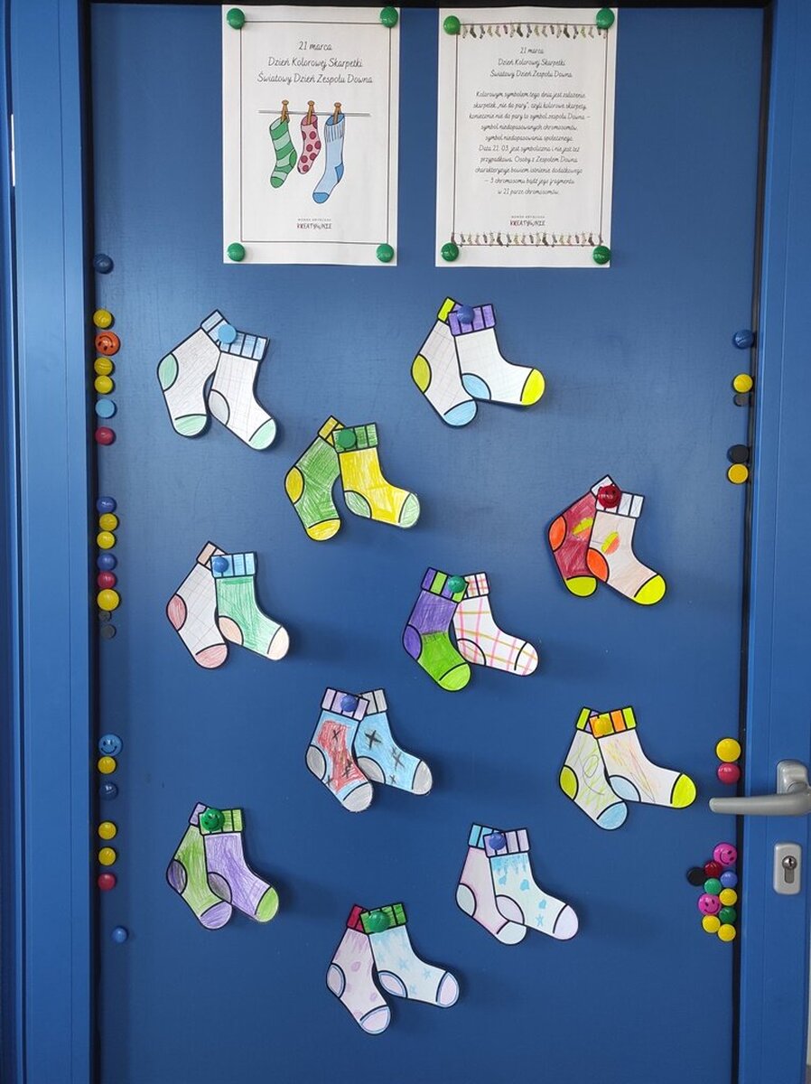 Tego dnia uczniowie mieli okazję obejrzeć film edukacyjny, który opowiadał o osobach z Zespołem Downa. Uczniowie wykazali się wspaniałą postawą - wiedzieli jak się zachowywać i czego nie robić widząc takie osoby. Dzieci wykonały pracę plastyczną "Skarpetki", które oczywiście były nie do pary. Niektórzy pamiętali także, aby tego dnia ubrać dwie różne skarpetki, dlatego zrobiliśmy wspólne pamiątkowe zdjęcie.
