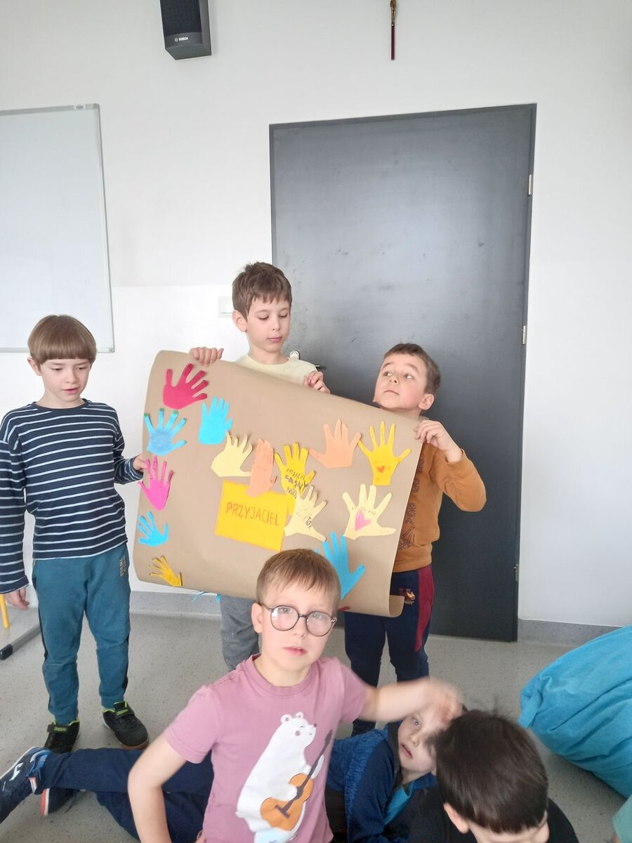 “Przyjaźń to akceptacja drugiego człowieka takim, jaki jest” - takimi przemyśleniami rozpoczęliśmy pierwszy tydzień kwietnia, tworząc wspólnie definicję przyjaźni. Uczniowie starali się ułożyć przepis na dobrego przyjaciela. Podjęliśmy także ważne dyskusje na temat agresji i złości oraz ich przeciwdziałaniu. Ponadto uczyliśmy się sposobów dostrzegania i wyrażania agresywnych odczuć przez zabawę i ćwiczenia: “Kiedy jestem wściekły...”, “Kartki złości”, “Mówiące dłonie”. Dzieci w grupach tworzyły plakat pt. “Stop agresji”.