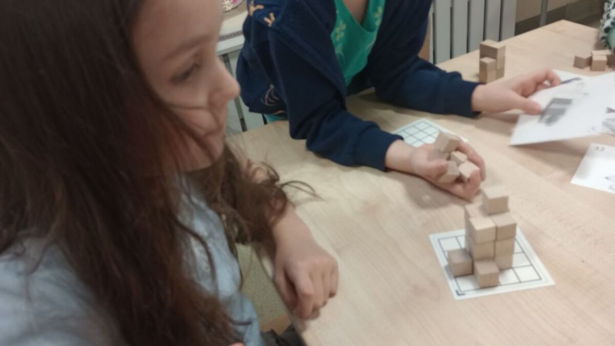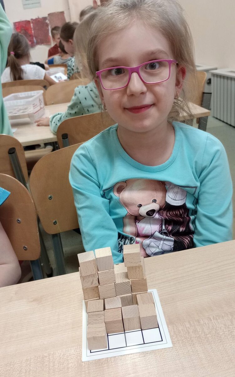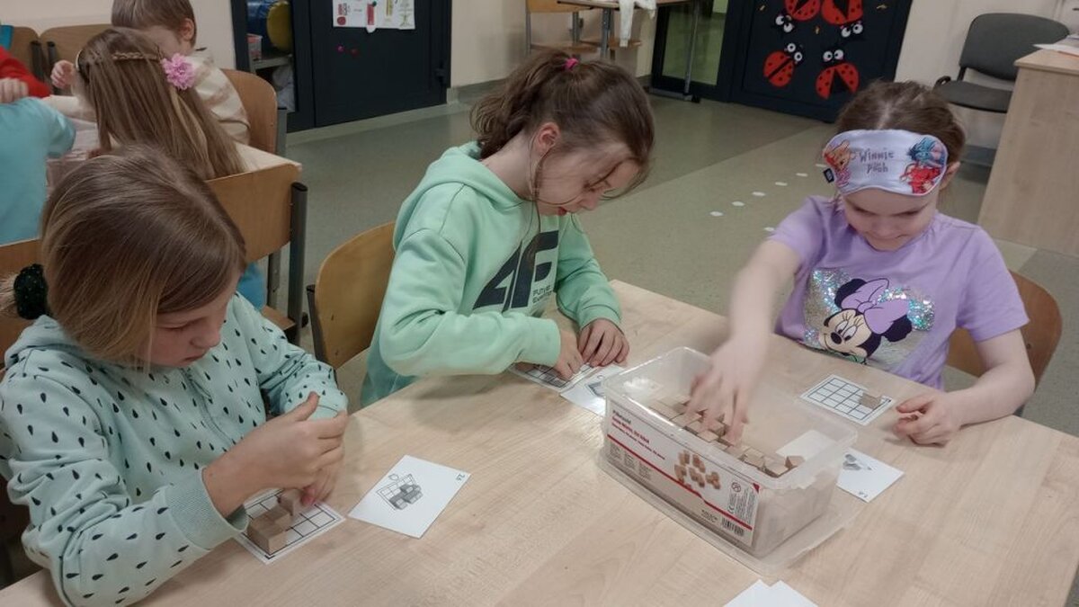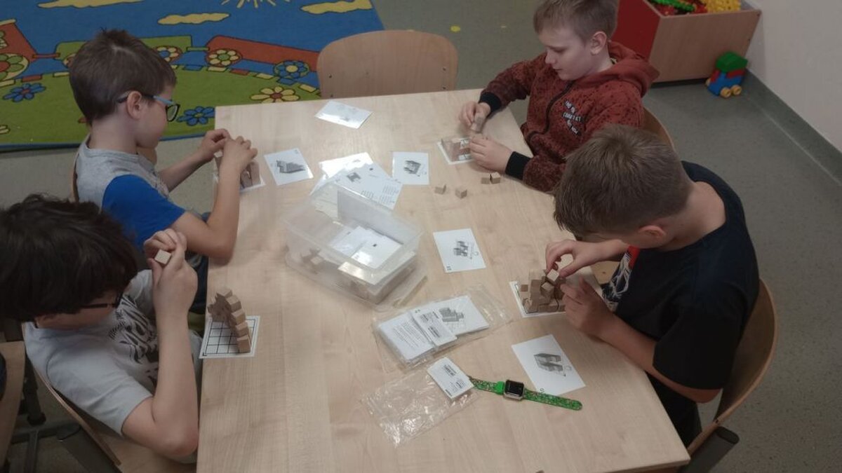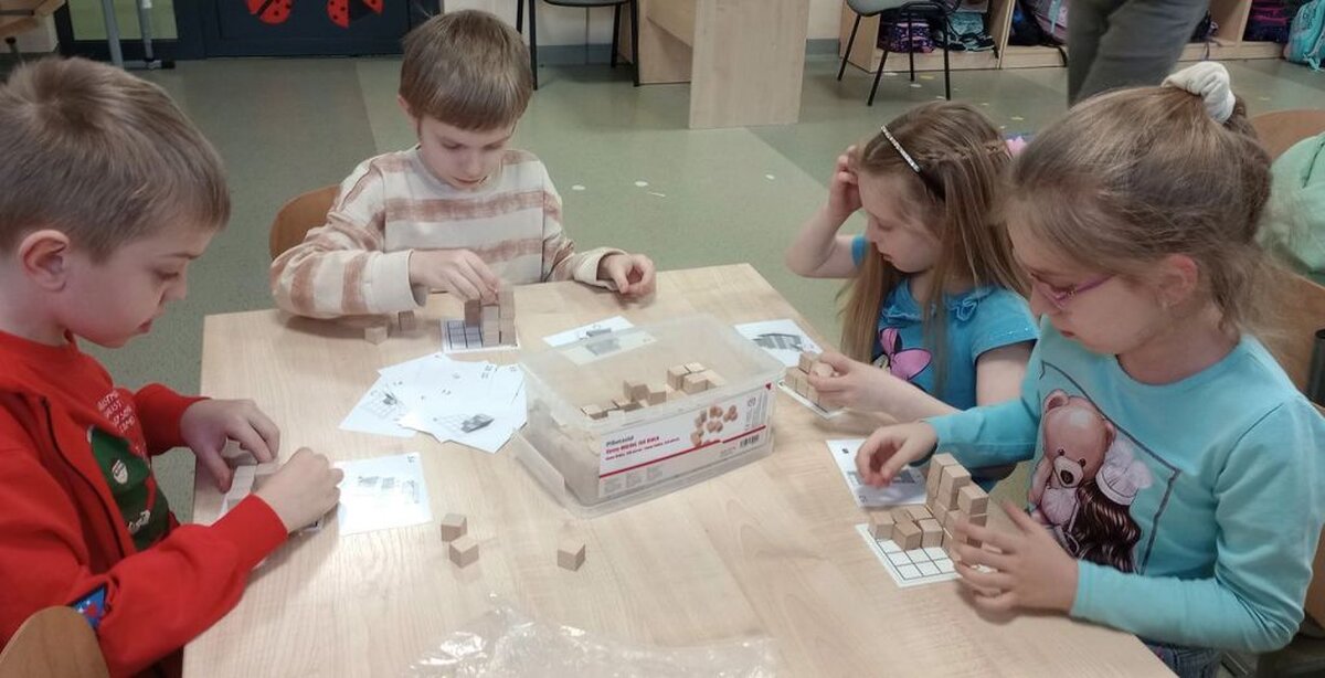 Wykorzystując klocki „Cubo”, zakupione w ramach projektu „Laboratorium Przyszłości”, uczniowie spędzający czas w świetlicy szkolnej wznosili mini budowle konstrukcyjne z drewnianych sześcianów, rozwijając wyobraźnię i myślenie przestrzenne oraz intuicję geometryczną, co było dla nich ciekawą formą nauki przez zabawę.