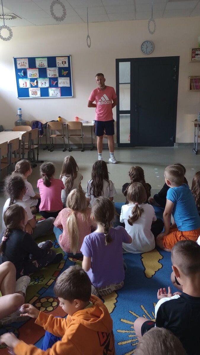 Pan Łukasz, który jest również nauczycielem wychowania fizycznego w naszej szkole i prowadzi w niej zajęcia taneczne, opowiedział dzieciom w świetlicy szkolnej swoją historię i zaprosił na mini warsztaty tańca, w czasie których dzieci mogły poznać kilka figur tanecznych i wykonać taniec z ich wykorzystaniem.