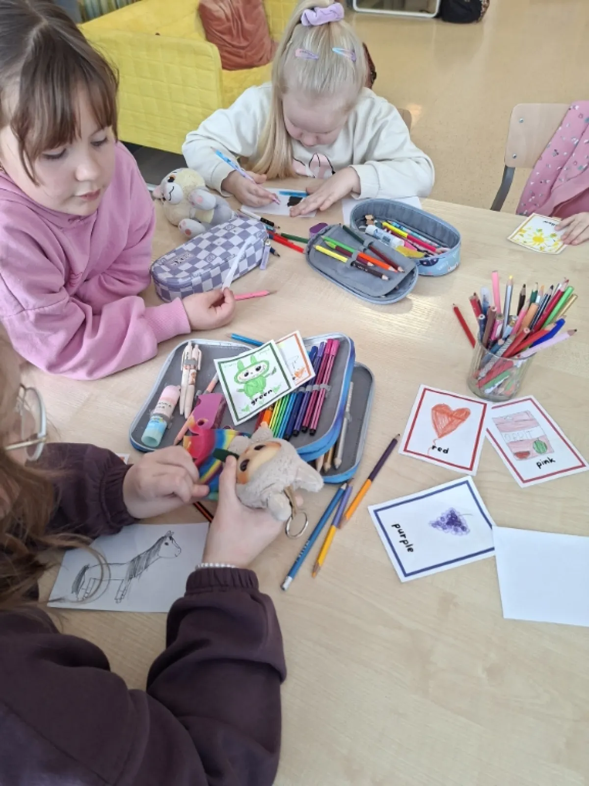 W ramach projektu „Angielski jest Fun-tastyczny” dzieci realizowały zadanie flashcards – colors. Uczniowie rysowali obrazki w różnych kolorach, tworząc własną talię kart do nauki słownictwa związanego z kolorami w języku angielskim.