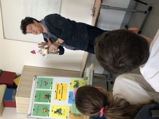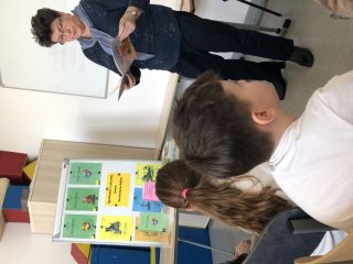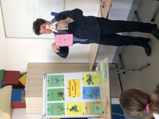 Podczas spotkania z uczniami klas 1e i 1d pisarka wyjaśniła dzieciom, skąd czerpała pomysły do pisania utworów . Omówiła proces powstawania książki-od pomysłu do jej wydania. Następnie przeczytała fragment „Przygody skrzata Chichotka’ oraz wierszyki z książeczki „Żyj zdrowo i kolorowo”. Dzieci słuchały z zaciekawieniem oraz żywo reagowały na jej słowa. Zadawały pisarce dużo różnych pytań, na które Pani autorka chętnie odpowiadała. Na koniec spotkania uczniowie mogli nabyć książkę i uzyskać autograf z dedykacją. W podziękowaniu dzieci wręczyły pisarce własnoręcznie przygotowane laurki.