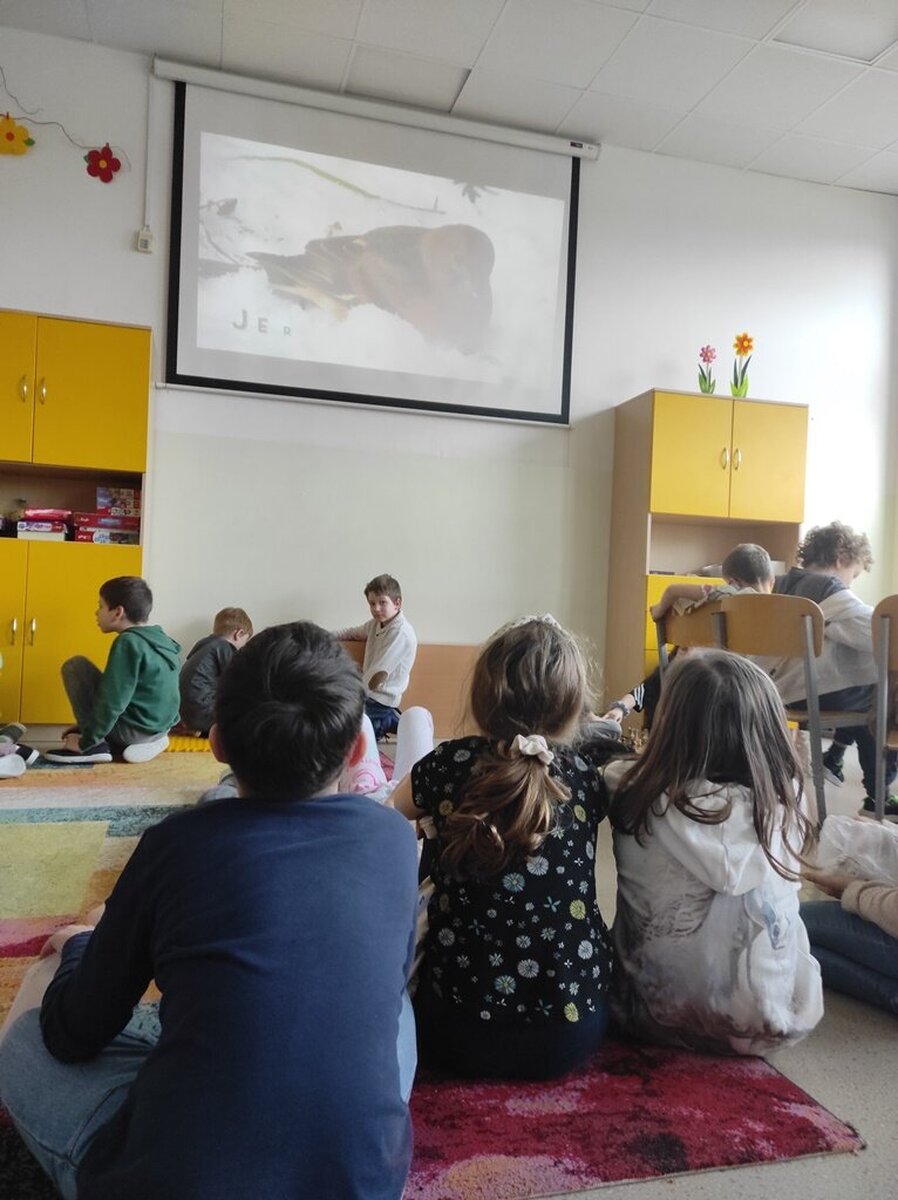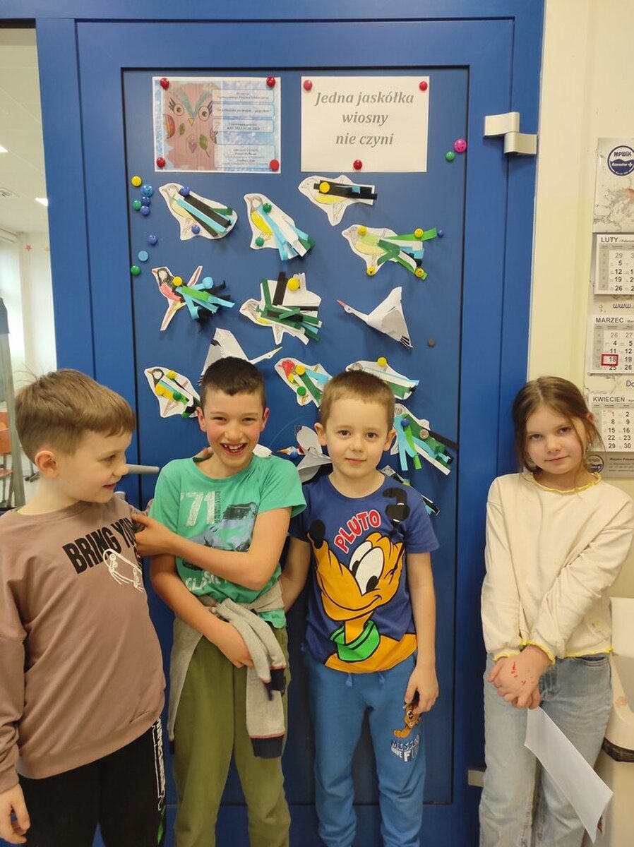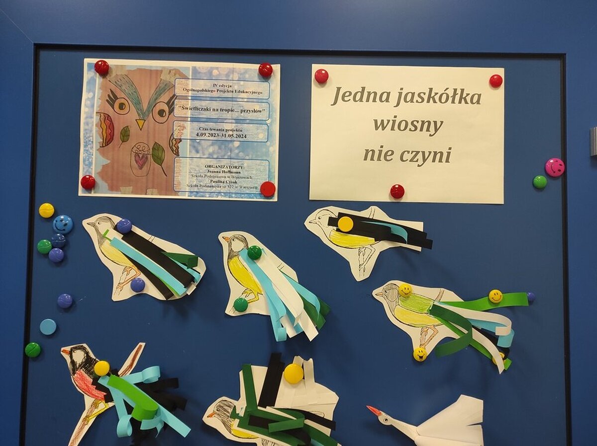 Podczas kolejnych zajęć w ramach Ogólnopolskiego Projektu "Świetliczaki na tropie... przysłów" grupa Odkrywców poznawała kolejne przysłowie - "Jedna jaskółka wiosny nie czyni". Uczniowie poznali znaczenie przysłowia i próbowali odnieść je do codziennego życia. Następnie zaprezentowano ptaki, które przylatują do Polski na wiosnę. Uczniowie wykazali się dużą znajomością takich ptaków. Następnie, przy użyciu mat do kodowania, zagraliśmy w "Ptasie statki", czyli wykorzystując zasady gry w "Statki" umieszczaliśmy na planszy nazwy ptaków. Gra była naprawdę wciągająca. Na koniec zajęć uczniowie wykonali kolorowe ptaki.