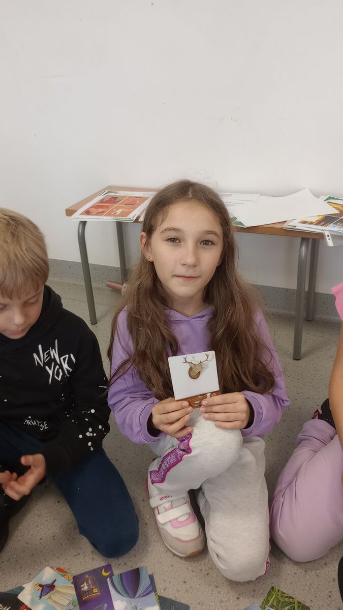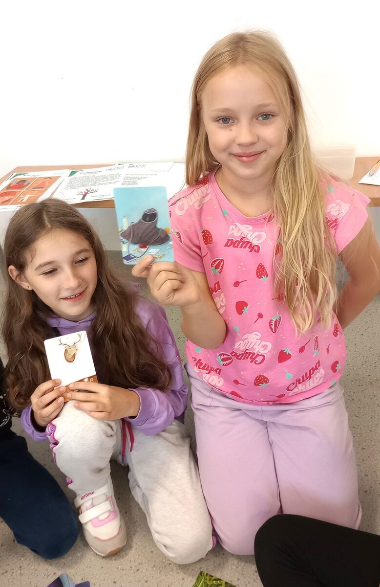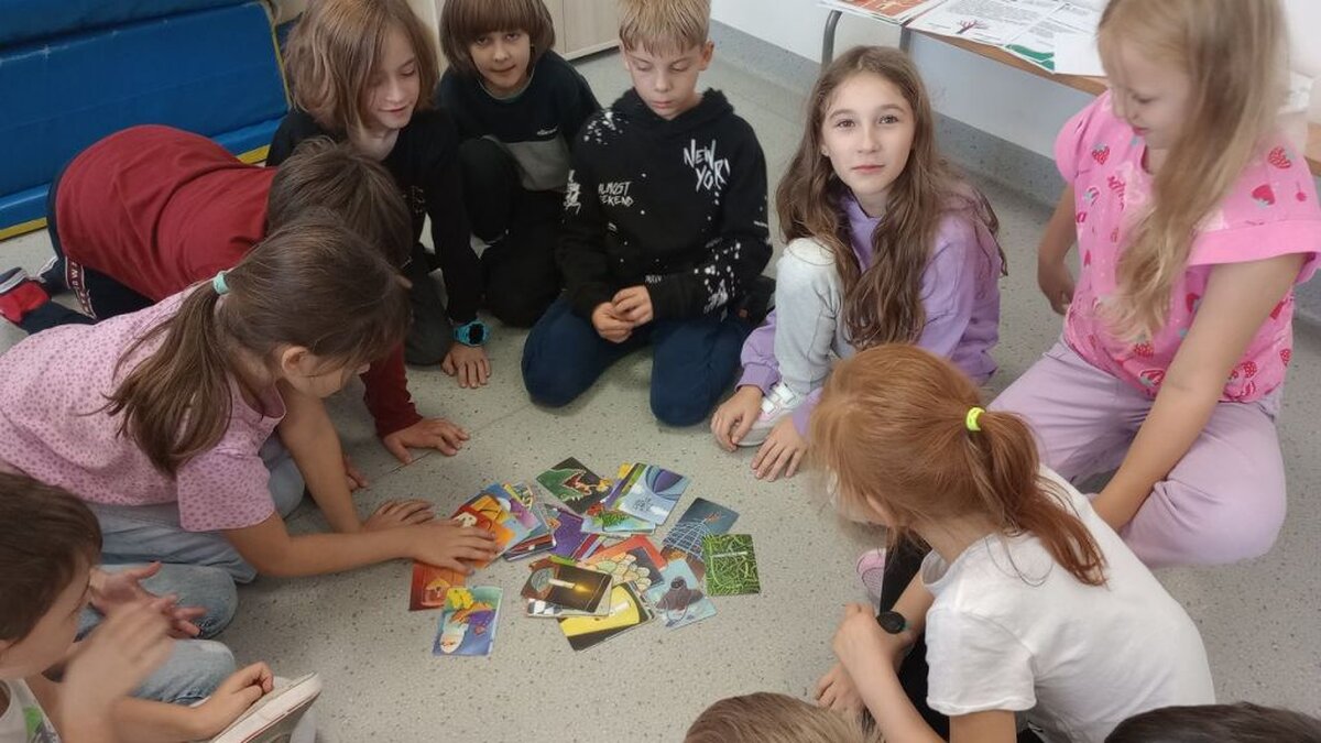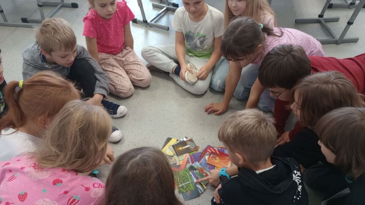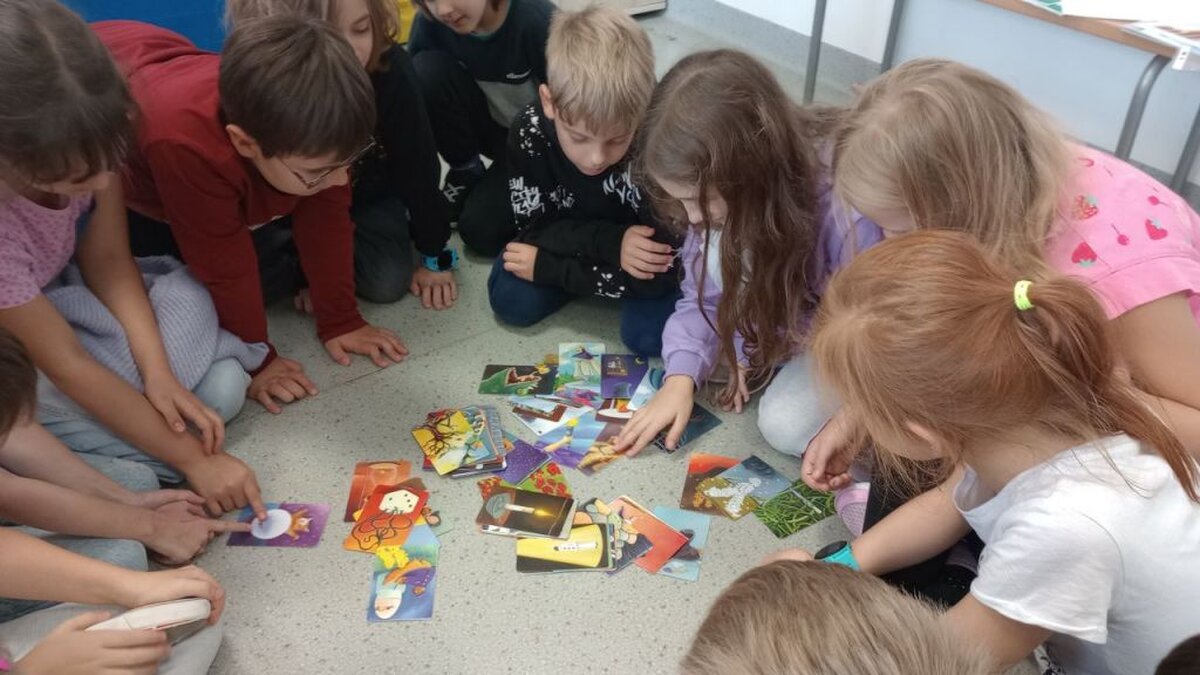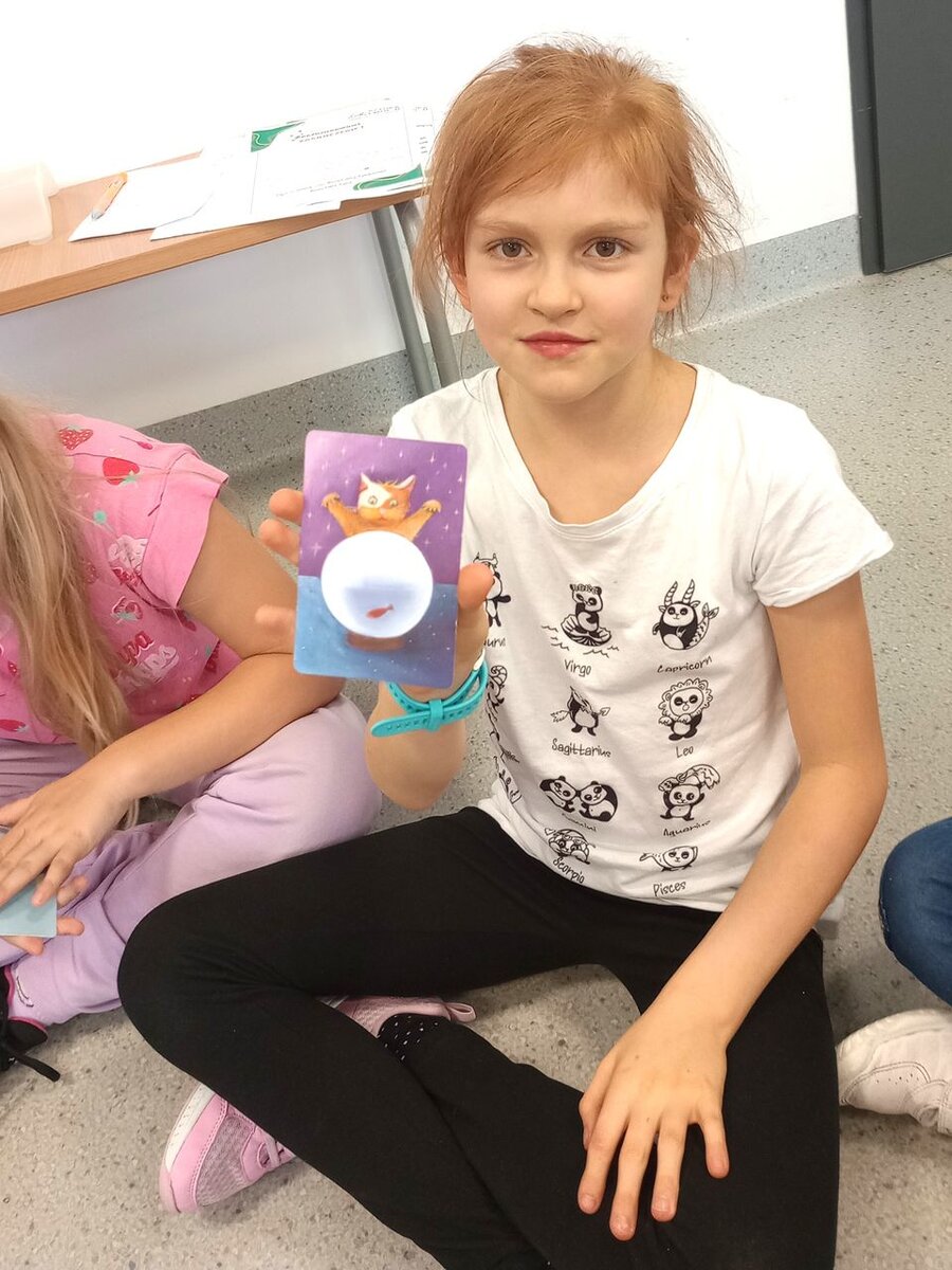 Uczniowie wspólnie w kole, po wypełnieniu przestrzeni w środku kartami z gry Dixit określali swoje samopoczucie wybierając jedną kartę na przywitanie.