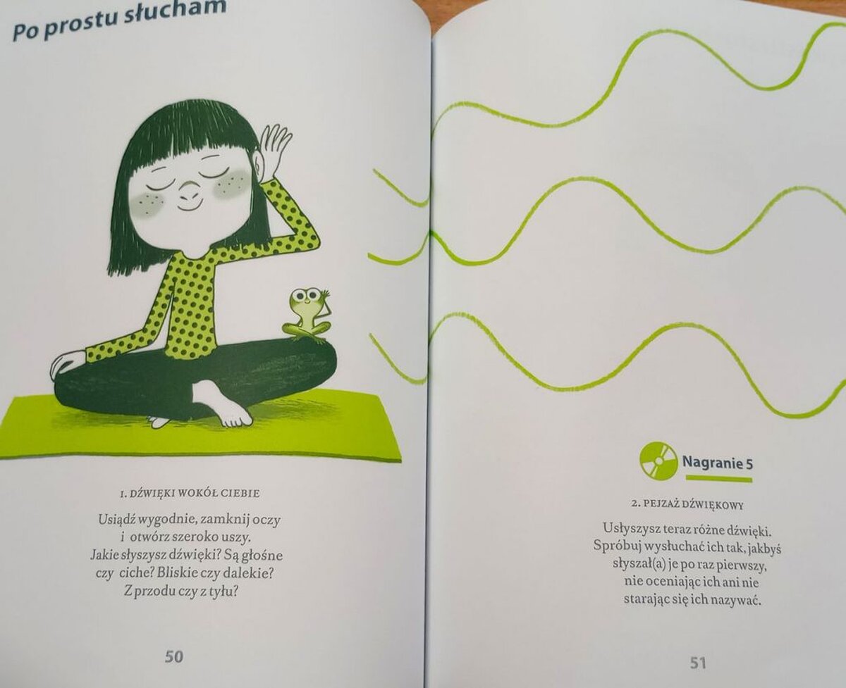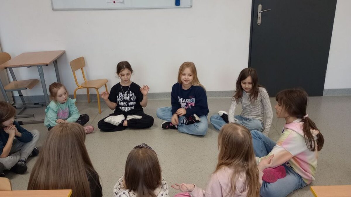 Na początku zajęć sięgnęliśmy do książki Eline Snel „Uważność i spokój żabki”, podczas krótkiego ćwiczenia uważności „Po prostu słucham” uczniowie wysłuchali z zamkniętymi oczami, różnego rodzaju dźwięków w ramach relaksacji, w taki sposób, jakby słyszeli je po raz pierwszy, nie oceniając ich, ani nie starając się ich nazywać.