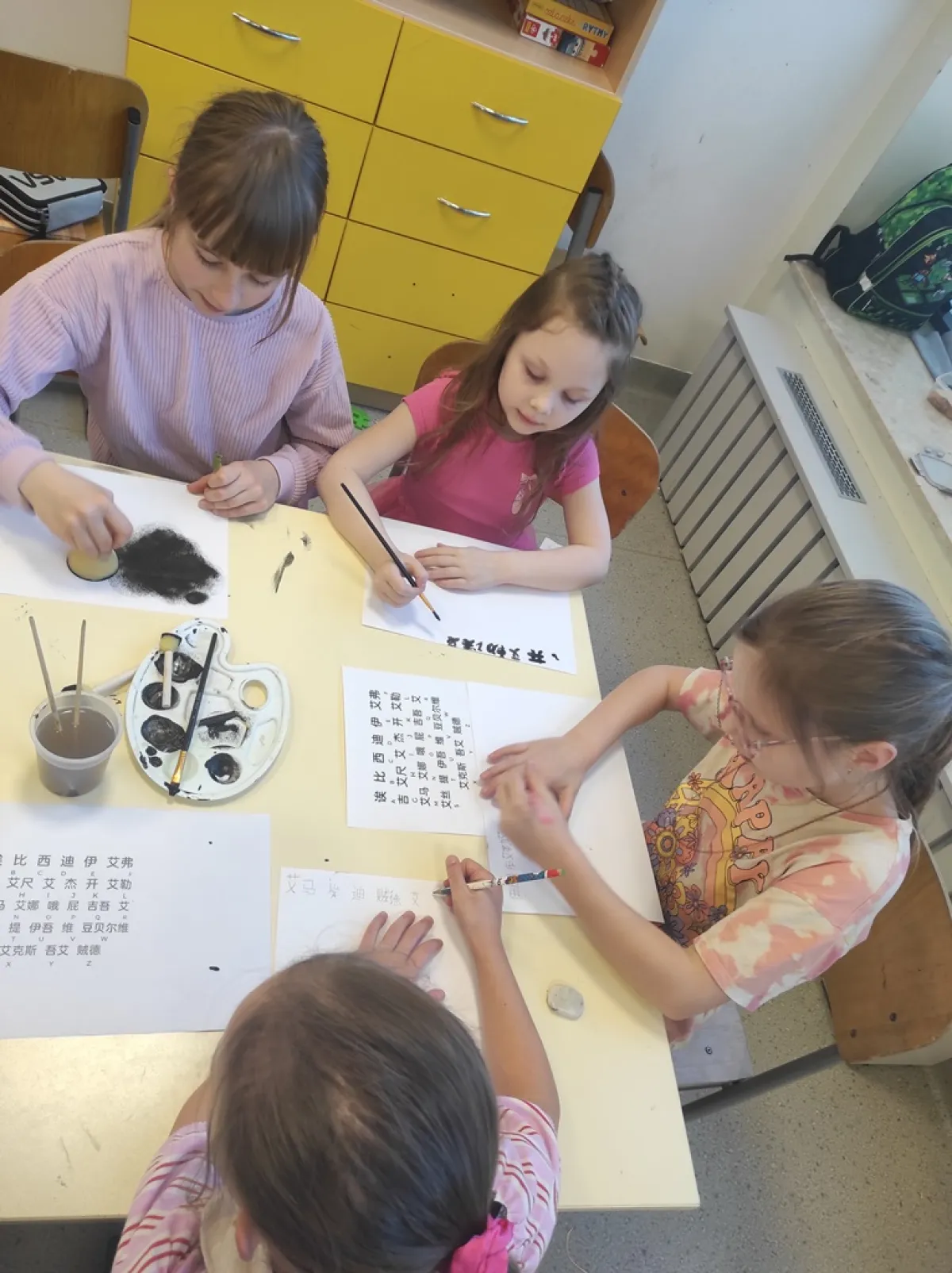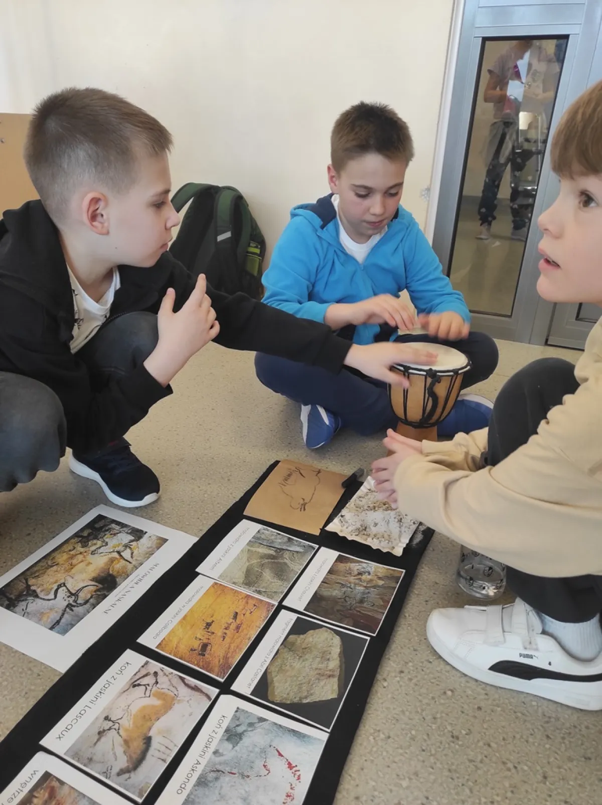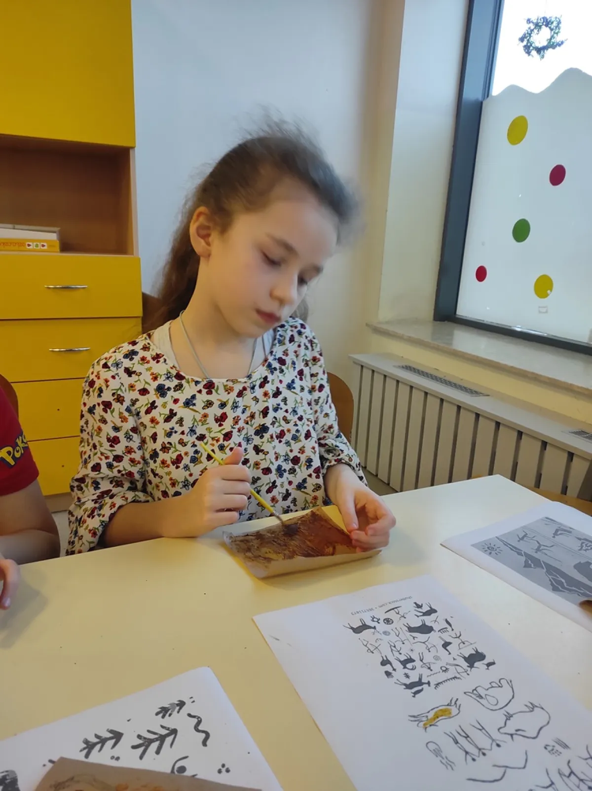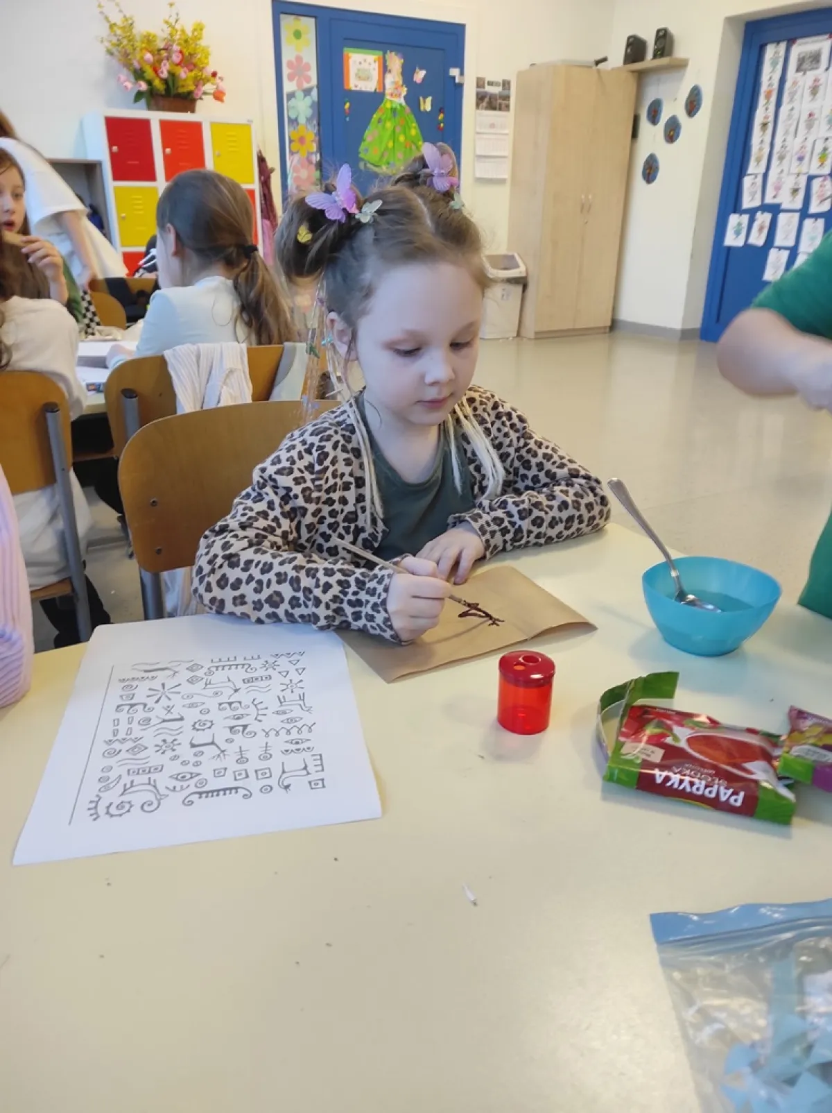 Mali artyści spróbowali swoich sił w tworzeniu malunków naskalnych, nawiązując do pierwotnych form komunikacji, które były stosowane przez naszych przodków. Używali w tym celu naturalnych farb, zrobionych z przypraw. Podczas zajęć mali twórcy tworzyli własne papirusy, na których rysowali hieroglify, inspirując się starożytnymi Egipcjanami. Kolejnym krokiem było lepienie glinianych tabliczek, na których dzieci mogły pisać pismem klinowym – jednym z najstarszych systemów pisma. Następnie, młodzi uczniowie przenieśli się do Chin, gdzie pisali swoje imiona pismem chińskim, a także tworzyli wiadomości, odciskając literkowe pieczątki.