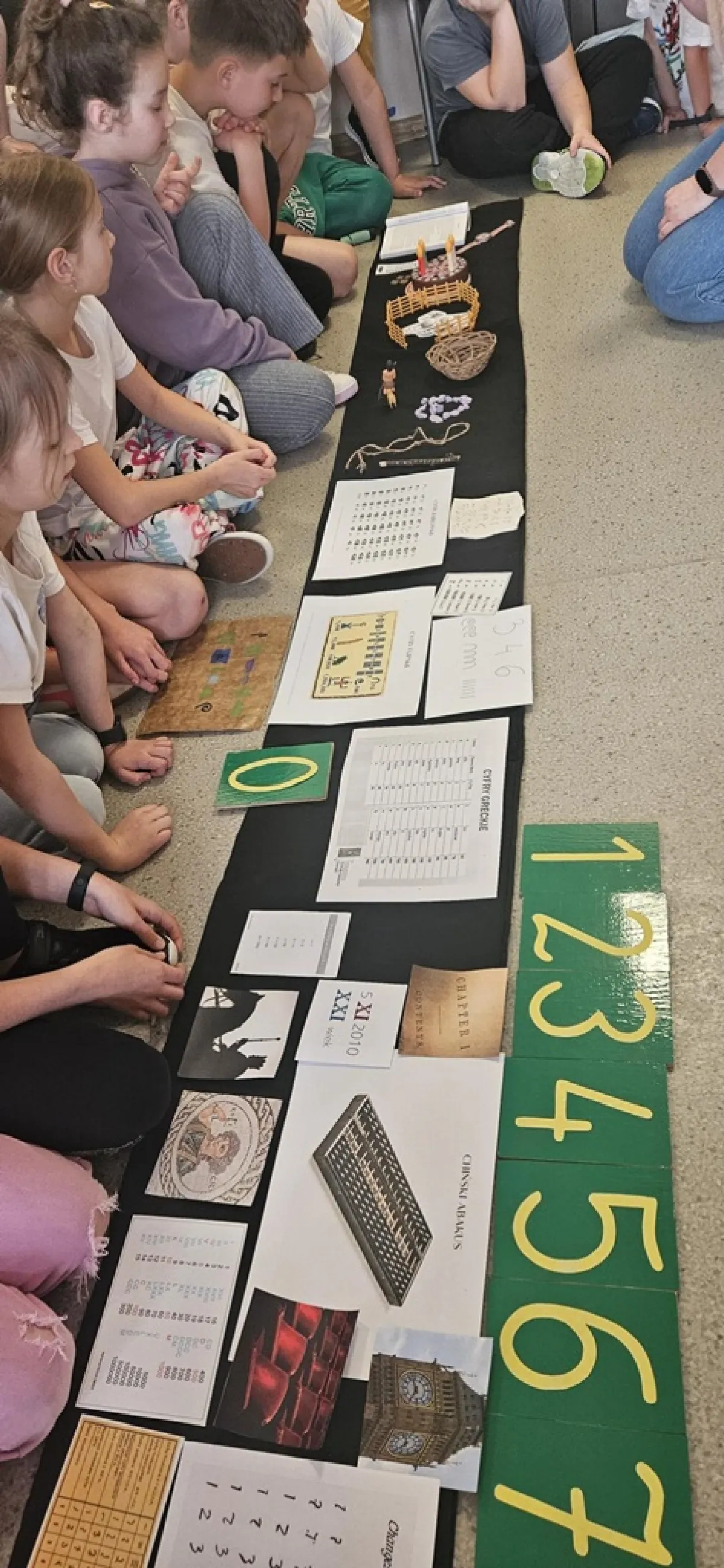 W ramach realizowanej innowacji pedagogicznej uczniowie mieli okazję uczestniczyć w wyjątkowych zajęciach opartych na Piątej Wielkiej Opowieści Montessori – "Historia liczb". To fascynująca opowieść, która wprowadza dzieci w świat matematyki poprzez historię rozwoju liczb i systemów liczbowych. Uczniowie dowiedzieli się, jak ludzie na przestrzeni wieków radzili sobie z liczeniem i jak powstawały systemy liczbowe, które dziś są podstawą nauki matematyki.