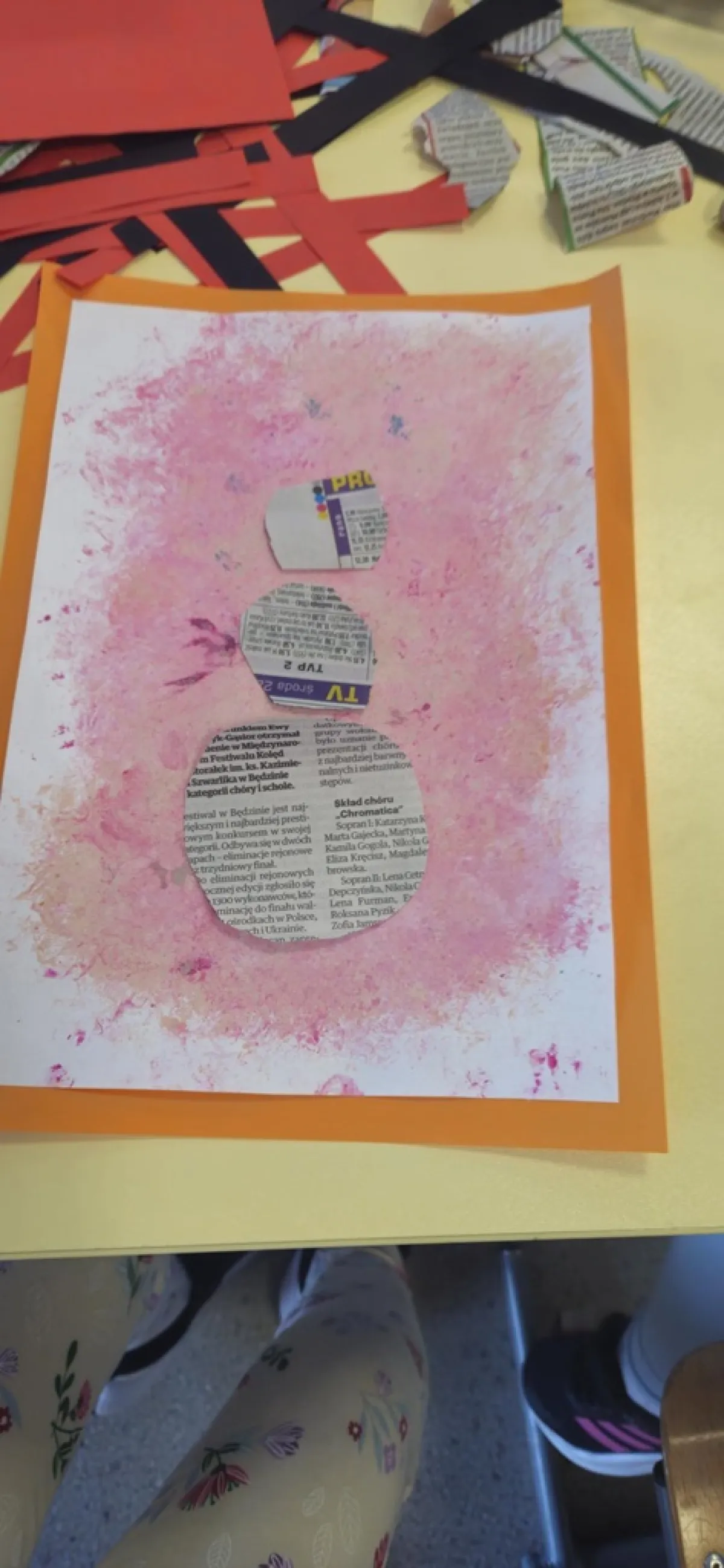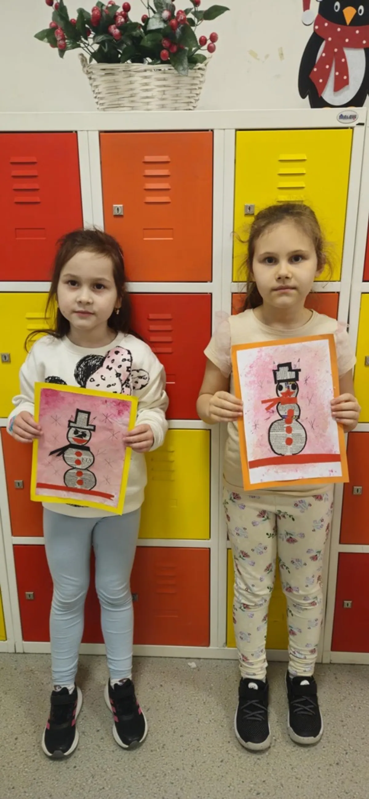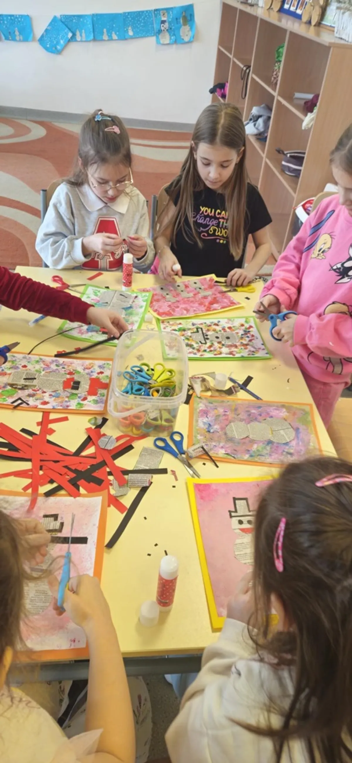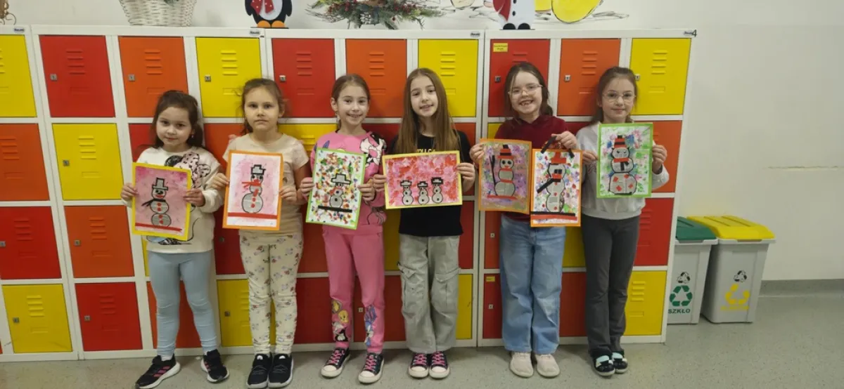 Na przygotowanym wcześniej przez uczniów wielokolorowym tle "lepiliśmy" bałwana wycinając odpowiednie kształty. Przy okazji ćwiczyliśmy wycinanie nożyczkami po okręgu. Doskonaliliśmy sprawność manualną, koordynację ręka oko oraz wyzwalaliśmy naszą kreatywność! Czas minął nam bardzo szybko, a efekty pracy przyniosły wiele radości.