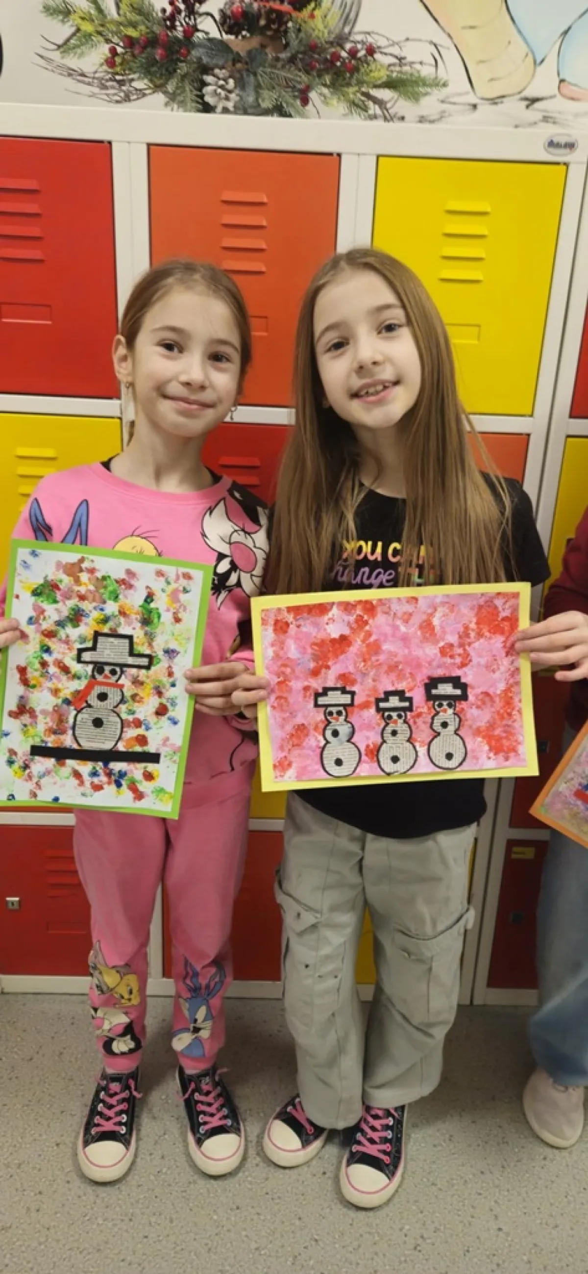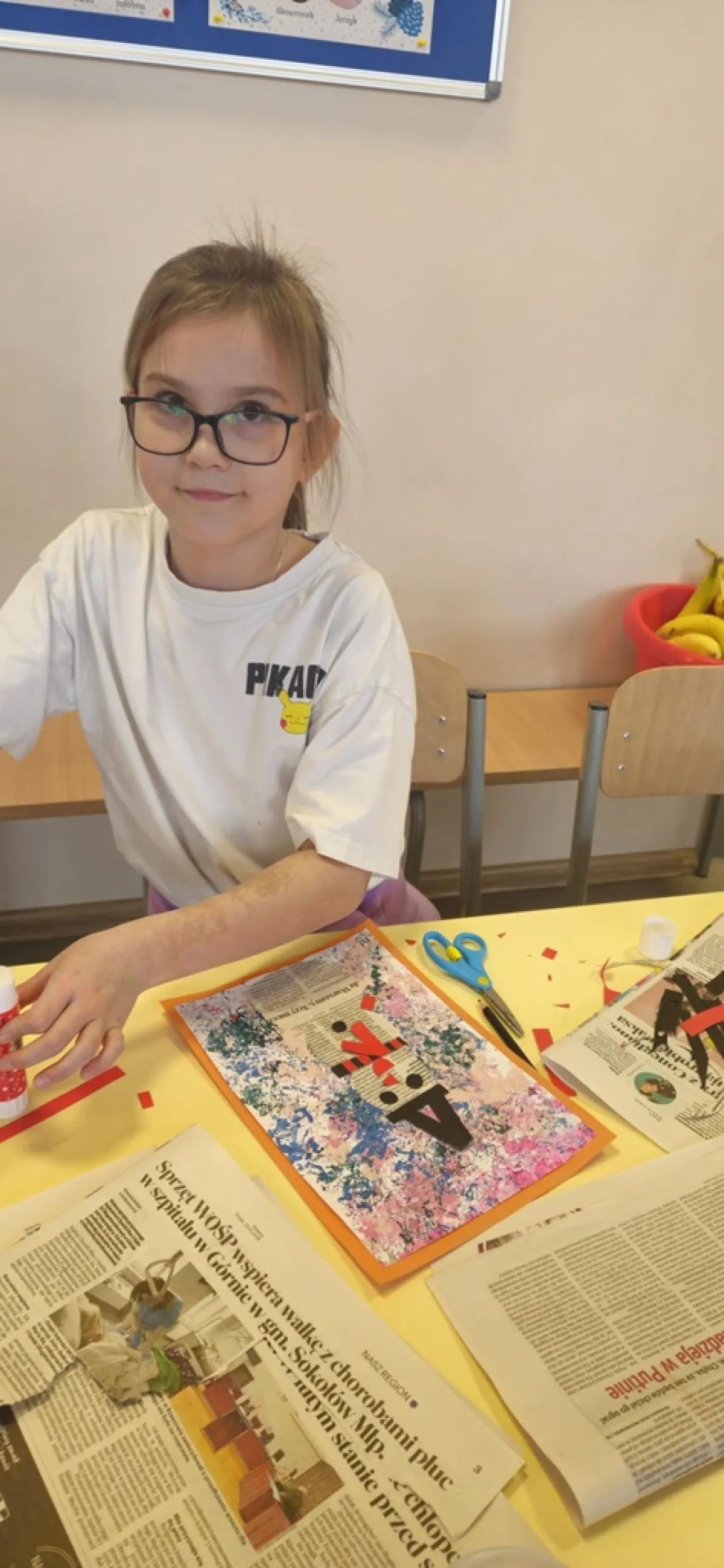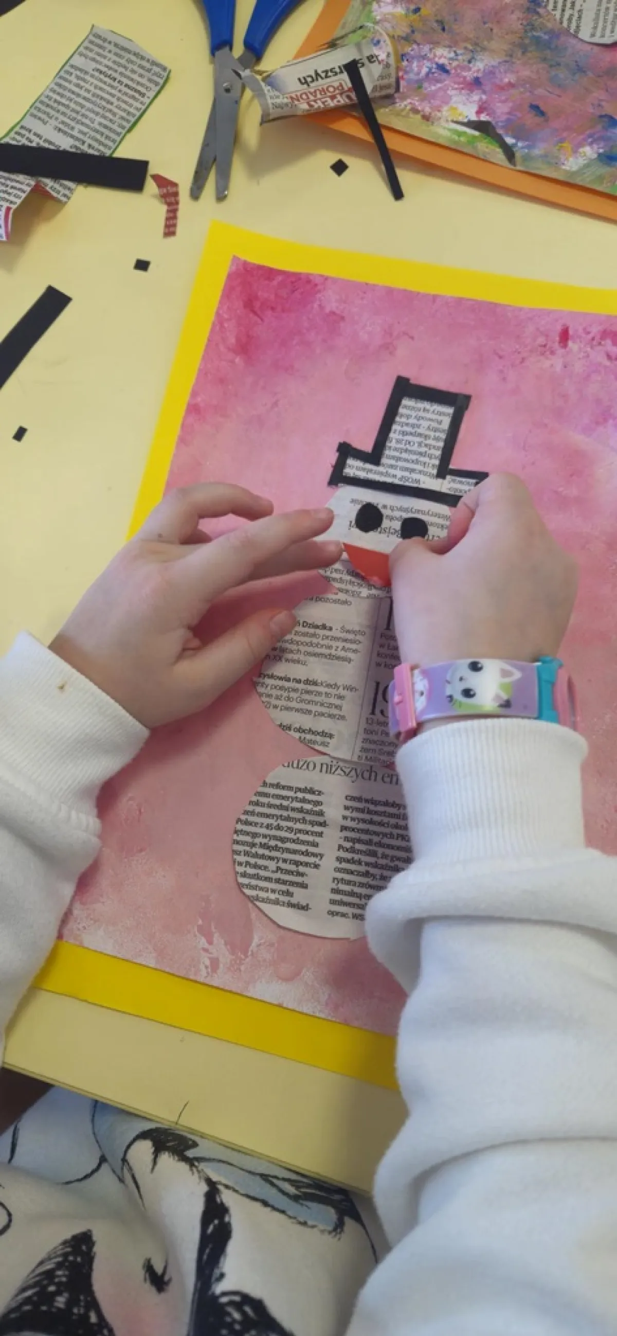 Na przygotowanym wcześniej przez uczniów wielokolorowym tle "lepiliśmy" bałwana wycinając odpowiednie kształty. Przy okazji ćwiczyliśmy wycinanie nożyczkami po okręgu. Doskonaliliśmy sprawność manualną, koordynację ręka oko oraz wyzwalaliśmy naszą kreatywność! Czas minął nam bardzo szybko, a efekty pracy przyniosły wiele radości.