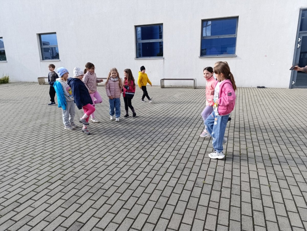 Podczas zajęć na świeżym powietrzu uczniowie uczestniczyli w krótkiej rozgrzewce, a następnie wspólnie uczyli się prostych układów tanecznych do znanych, rytmicznych piosenek. Wesoła muzyka, dobra energia i piękna pogoda sprawiły, że każdy chętnie włączał się do zabawy. Dzieci z entuzjazmem prezentowały swoje taneczne umiejętności, a wspólny taniec przyniósł wszystkim wiele radości i śmiechu.