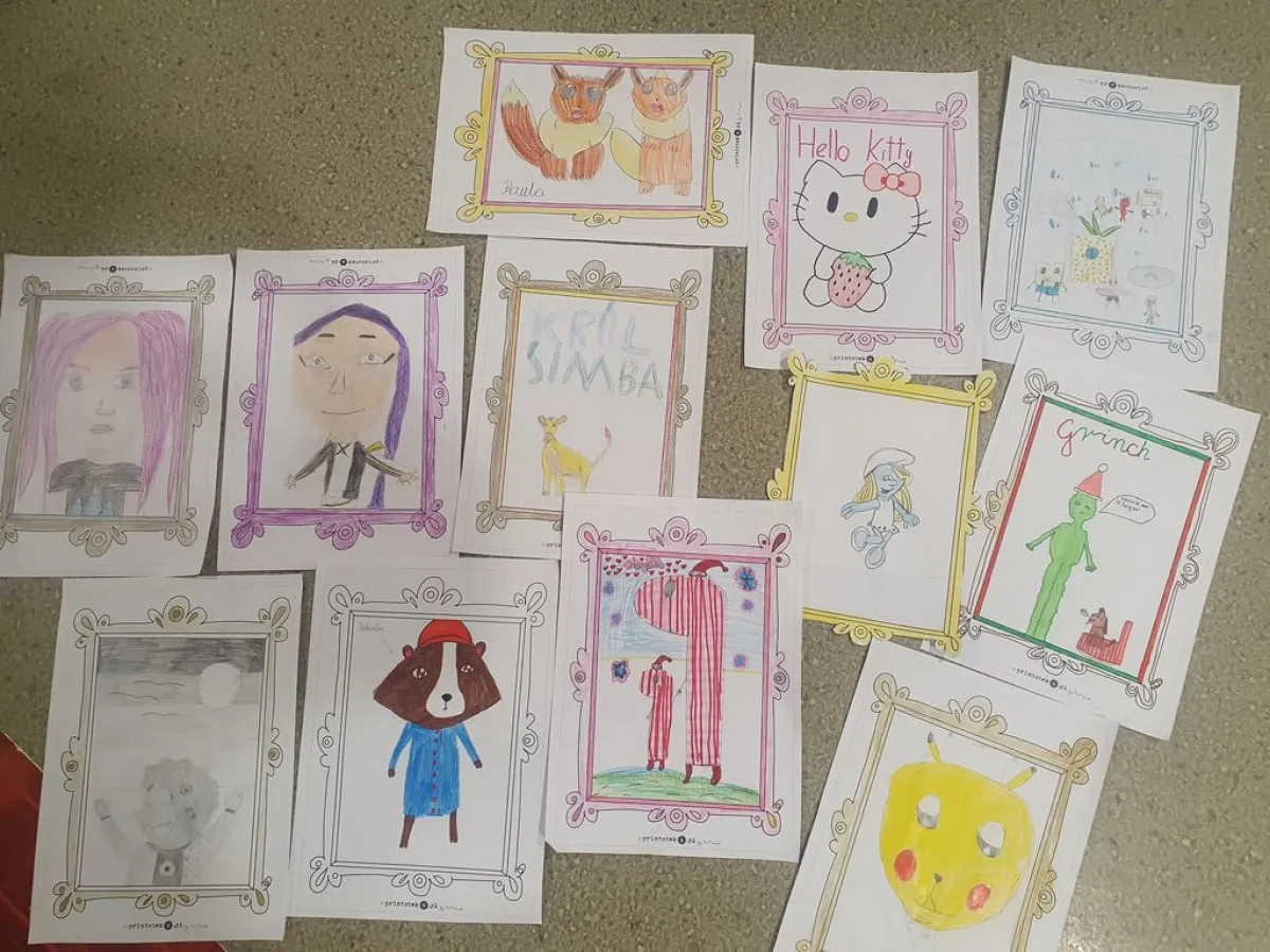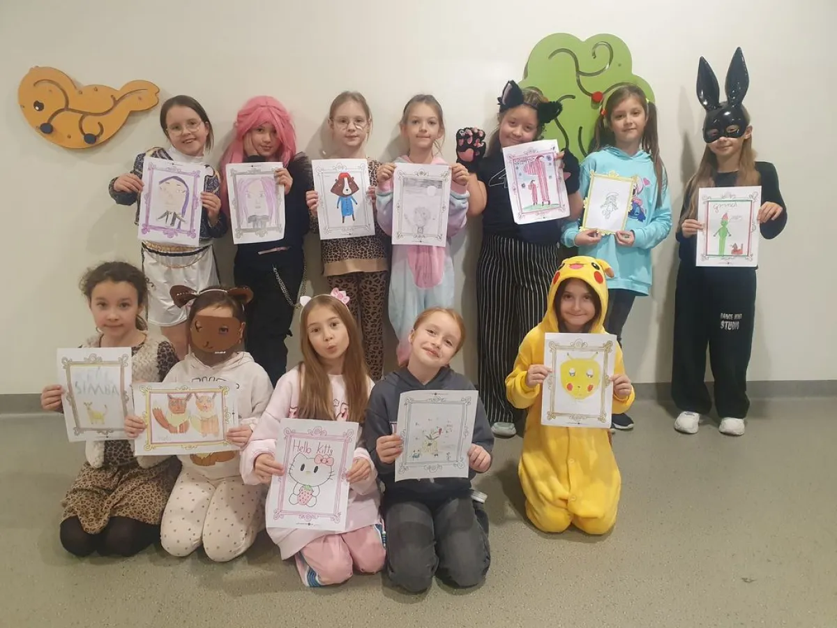 W dalszej części zajęć dzieci miały za zadanie narysować swoją ulubioną postać z bajki. Było to nawiązanie do Dnia Postaci z Bajek, który obchodziliśmy tego dnia. Panowała radosna, twórcza atmosfera, tym bardziej że uczniowie przyszli w bajkowych strojach. Zajęcia były wyjątkowe, pełne