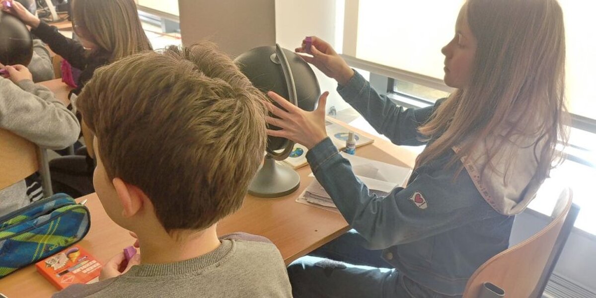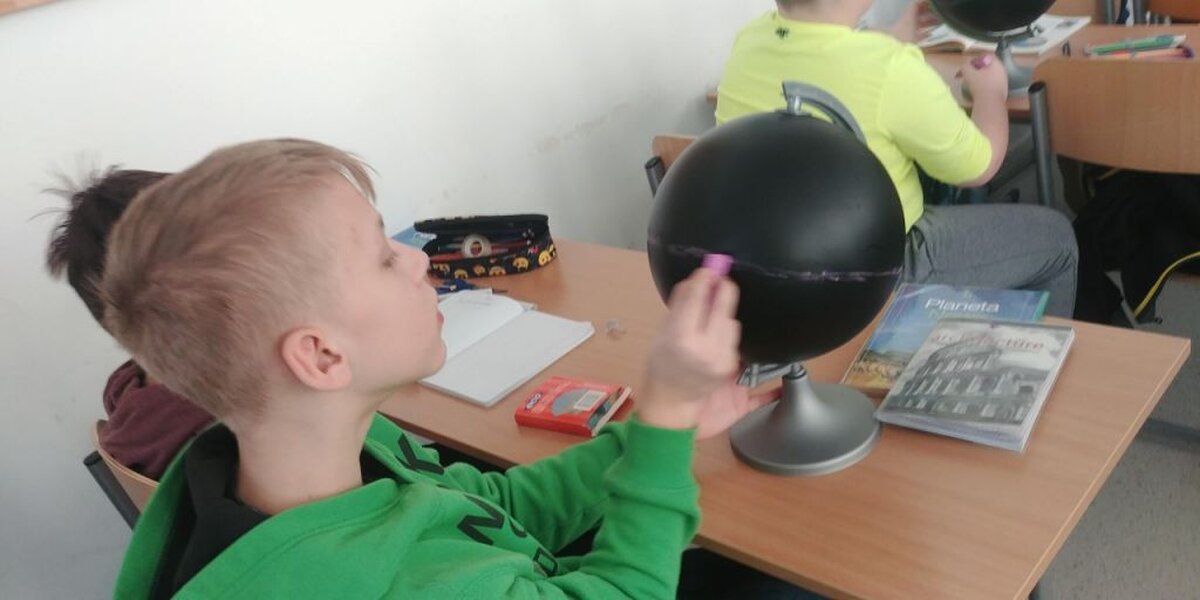 Uczniowie klas piątych posłużyli się globusem indukcyjnym, aby zrozumieć czym są południki i równoleżniki. Z dużą starannością i skupieniem kreślili je po globusach. Dzięki takim zajęciom uczniowie lepiej zapamiętają omawiane zagadnienia.