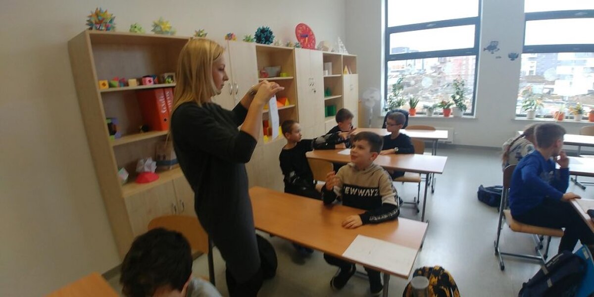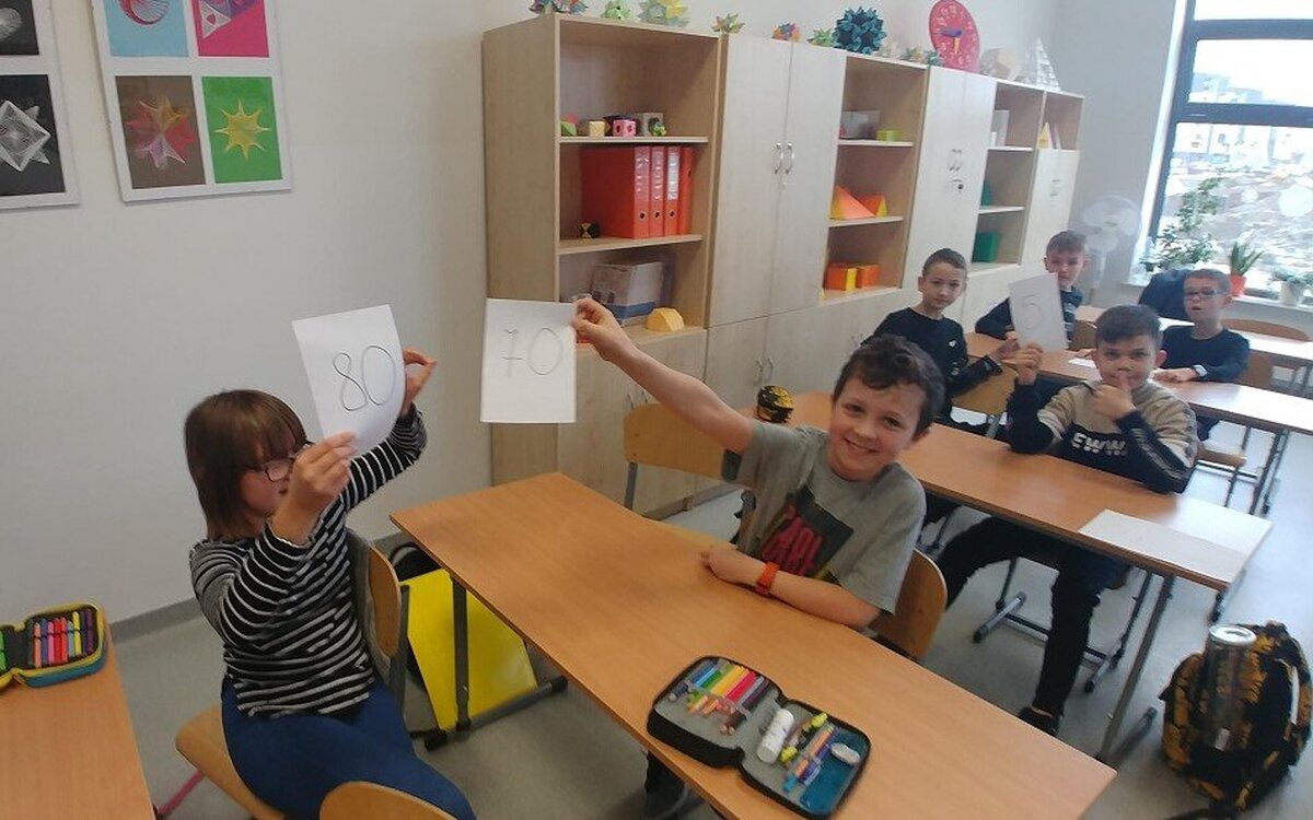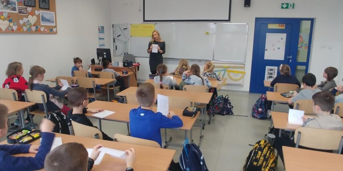W dniu 3 lutego 2020 roku, w ramach współpracy z Uniwersytetem Rzeszowskim, uczniowie klasy 4a uczestniczyli w warsztatach matematycznych. Zajęcia prowadziła pani dr Bożena Maj- Tatsis, która w swojej pracy naukowej koncentruje się wokół procesu kształtowania i rozwijania aktywności matematycznych o charakterze twórczym. Zajęcia miały na celu kształtowanie pojęcia liczby naturalnej i działań na liczbach poprzez zaangażowanie uczniów w gry i zabawy matematyczne. Lekcję rozpoczęła gra planszowa, w której uczniowie ćwiczyli działania na liczbach z zerami na końcu. Do tego dochodził element rywalizacji pomiędzy uczniami. Następnie uczniowie losowali po jednej liczbie naturalnej, wcielali się w rolę tej liczby i przedstawiali cechy tej liczby całej klasie. Kolejnym zadaniem było poszukanie innej liczby, z którą można stworzyć parę pod kątem cech wspólnych. Uczniowie sami dokonywali swoich wyborów, kryteria nie były narzucone. W ten sposób uczniowie poznawali i utrwalali cechy liczb naturalnych (liczby parzyste, liczby nieparzyste, dzielniki liczby, liczby pierwsze, liczby kwadratowe). Nauka przez zabawę daje uczniom radość działania, poznania i odkrywania oraz zwiększa motywację, dzięki temu omawiane zagadnienia zostają lepiej przez uczniów opanowane.