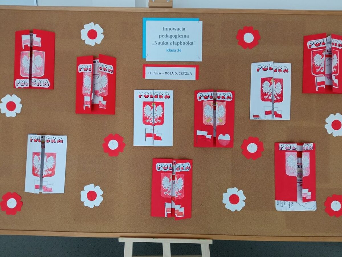 Kolejnym lapbookiem wykonanym przez uczniów z klasy 3e w ramach innowacji pedagogicznej był lapbook zatytułowany: „Polska - moja Ojczyzna”. Zagadnienia, które wspólnie zostały omówione i umieszczone w książeczce to: