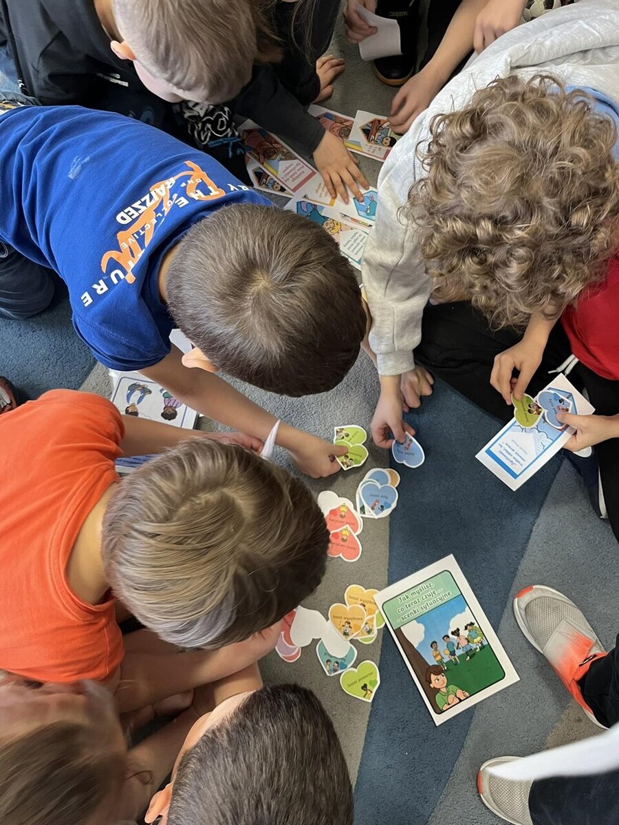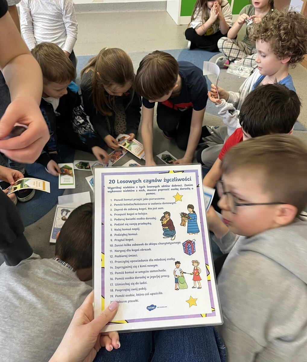 W ramach Międzynarodowego Projektu Czytelniczego „Magiczna moc bajek” uczniowie klasy 1d uczestniczyli w zajęciach kontynuujących tematykę życzliwości. Rozmawialiśmy na temat miłych i przykrych emocji oraz wspólnie zastanawialiśmy się, jak osoby przedstawione na prezentowanych kartach mogą się czuć w różnych sytuacjach. Kolejno rozmawialiśmy na temat postaw odpowiedzialności cywilnej, odwagi, pewności siebie oraz poczucia własnej wartości. Dzieci otrzymały zakładki do książek z życzliwymi słowami oraz pozdrowieniami, a także wybrały sobie symbole życzliwości w postaci serduszek z życzliwymi pozdrowieniami, które rozdały kolegom i koleżankom w szkole. Na koniec uczniowie wysłuchali opowiadań o życzliwości „Dom” oraz „Stare tenisówki” z książki „Wielka księga wartości” autorstwa Teresy Blanch i Anny Gasol.